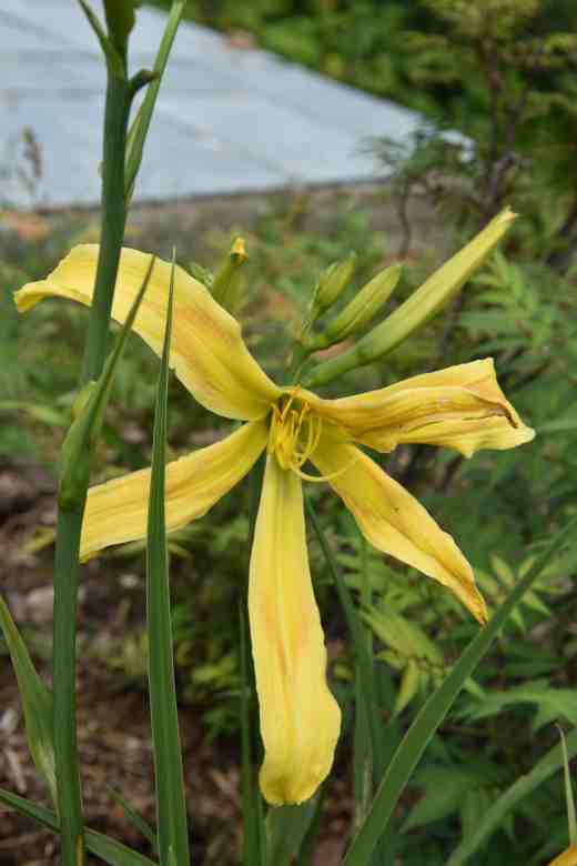 I have not quite decided which daylilies I like best, though the more I grow the more I am gravitating towards simpler, yellow varieties. Some of the really ‘fancy’ ones are a bit too much – to me at least. But I do like ‘spider’ and ‘UFO’ (unusual form) varieties. And here is ‘Heavenly Mr Twister’ which has blooms 20cm across. It was introduced in 2004, bred by Gossard, is winter-dormant, diploid and is 110cm high in bloom, though mine is rather shorter. I like the ‘madness’ of the flowers with a whirling curl of petals. It looks best when just one flower opens. The colour does not ‘scream’ across the garden but when you do notice it it merits a closer look.