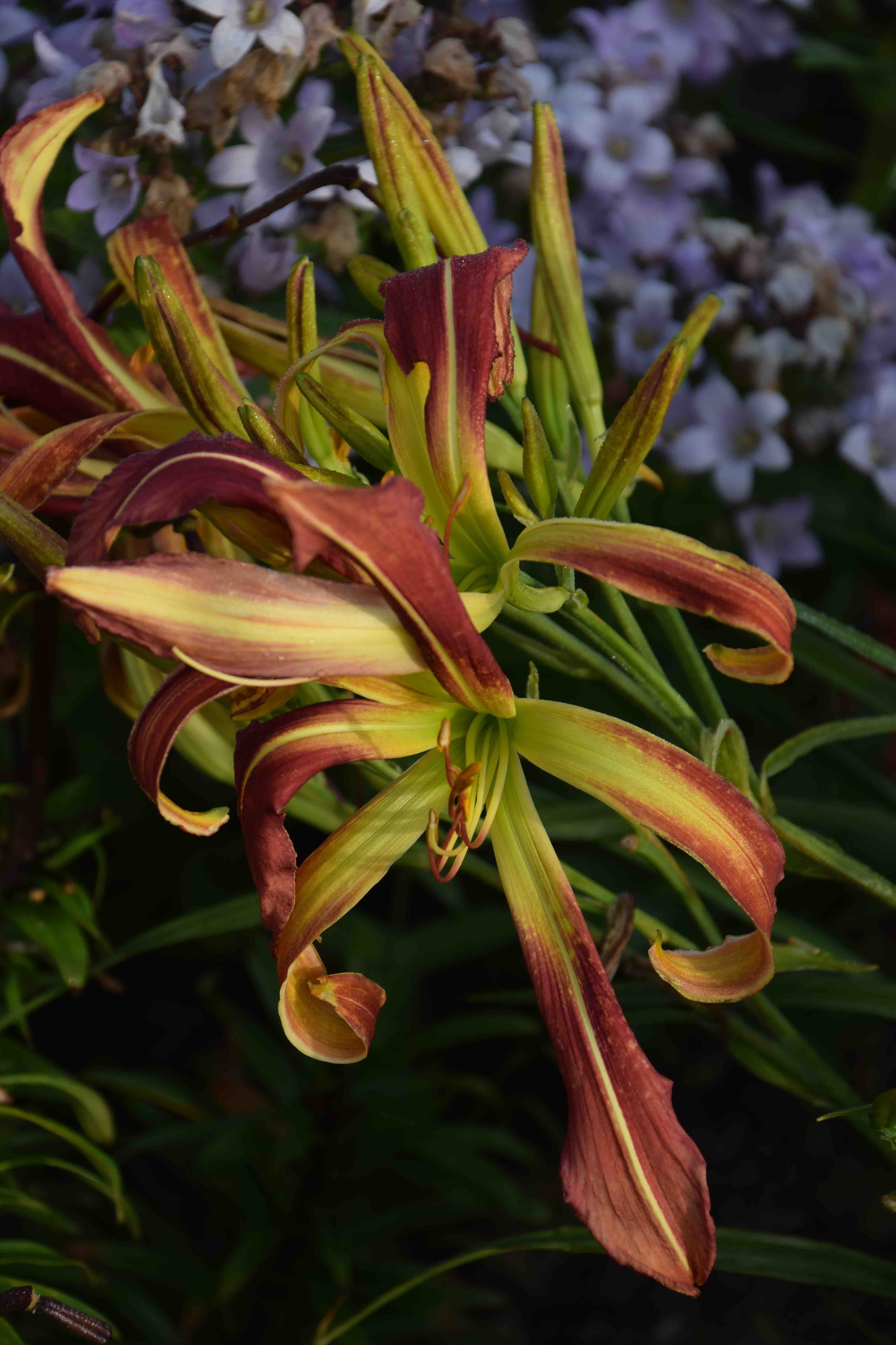 I have not quite decided which daylilies I like best, though the more I grow the more I am gravitating towards simpler, yellow varieties. Some of the really ‘fancy’ ones are a bit too much – to me at least. But I do like ‘spider’ and ‘UFO’ (unusual form) varieties. And here is ‘Heavenly Mr Twister’ which has blooms 20cm across. It was introduced in 2004, bred by Gossard, is winter-dormant, diploid and is 110cm high in bloom, though mine is rather shorter. I like the ‘madness’ of the flowers with a whirling curl of petals. It looks best when just one flower opens. The colour does not ‘scream’ across the garden but when you do notice it it merits a closer look.