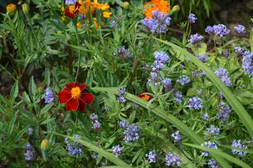 Asperula is very closely related to galium which includes the awful weed ‘cleavers’ or ‘stickyweed’ and the perennial sweet woodruff. The flowers are small with four petals and a short tube. Blue woodruff is a delightful annual with narrow leaves and masses of blue flowers in clusters. It is a hardy annual and may self-seed. I am not sure if seedlings will overwinter if they germinate in autumn. I grew the plants by sowing in cell trays in March and they were very scrawny when I planted them out but they slowly spread and started blooming fairly quickly. The seeds did not germinate very quickly – they took almost a month to show signs of life but they were in an unheated greenhouse so perhaps they needed more heat.