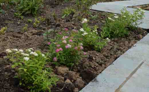 But I have started planting, where it won’t get walked on while we try to fit the timber together. Continuing the theme of plants in lines I bought five Spiraea japonica ‘Shirobana’. The soil in this area is not great, though I have done the best I can for them, and spiraeas are generally not too fussy. They are best known as spring-flowering shrubs though Spiraea japonica is very popular and has pink flowers for many months in summer. In recent years it has been intensively developed so it is best known as a shrub with colourful foliage, usually yellow or orange. The best known of all these is ‘Goldflame’ I think introduced in the 1970s. Although it sometimes reverts to produce shoots with green parts in the leaves it is a fabulous small shrub even if the deep pink flowers do jar with the leaves a bit. Instability seems to be inherent in the species and the old ‘Anthony Waterer’ has a tendency to produce narrow, cream and pink-tinted leaves among the green. All tend to have rather dusky (or dusty) deep pink flowers in flat heads. It is easy to be mean about these shrubs and they are a bit ‘carparky’ but sometimes you just need something easy and familiar.