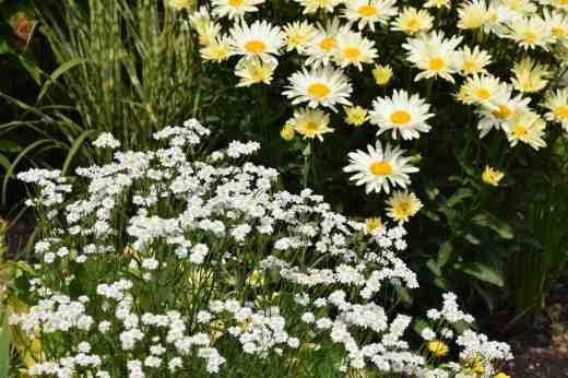 Nearby Achillea ‘The Pearl’ shimmers beside a clump of yellow leucanthemum.