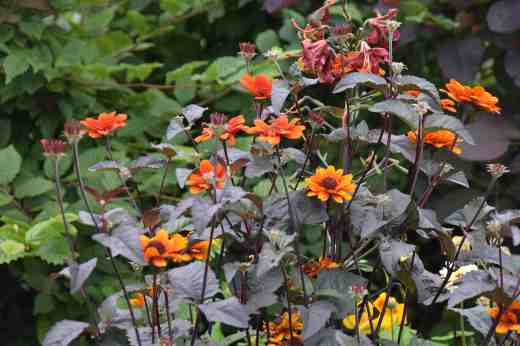 A plant that has delighted me this month is Heliopsis ‘Summer Nights’ or, to give it its full name, Heliopsis helianthoides var. scabra ‘Summer Nights’. I grew this from seed last year and although it flowers the first year, it has been better this year with more, sturdier stems and earlier flowers. A seed strain, originally from North Creek Nurseries, USA, and distributed in Europe by Jelitto Seeds, it is supposed to have golden flowers but all my plants have blooms in burnt orange. I am pleased about this because it gives a richness to the display. Planted in front of cotinus ‘Grace’, one group of plants blends in nicely! I think this is a great plant, sturdy, 1m high, neat and packed with long-lasting blooms. So far it has not punished me for lack of staking. It needs full sun but does not seem fussy about soil. Even without flowers the foliage is dramatic.