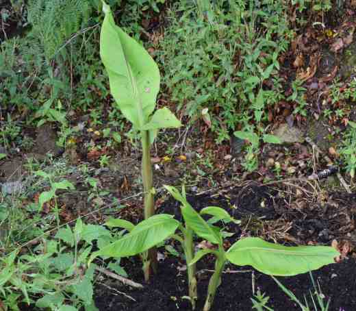 Last summer I made the decision that my banana (Musa basjoo) had to spend the winter outside. I want to grow it but the garden is really windy and the leaves get ripped to shreds. In a pot it was a real pain, being blown over every other week and I had had enough – it had to take its chances. I planted it beside the tall hedge at the front where it is protected from wind, as much as anything can be here, and it is slightly overhung by the hedge which will keep a little frost off. But it faces north so it is hardly a warm spot. The one pseudostem looked fine until about Christmas but then it fell over and I thought I had been to hard on it and it was all my fault. Until about a month ago, when I saw a shoot growing. Within a few weeks there were more and it is now growing quite vigorously. I promise I will be a lot kinder to it this winter now that I know it has a chance of doing well.