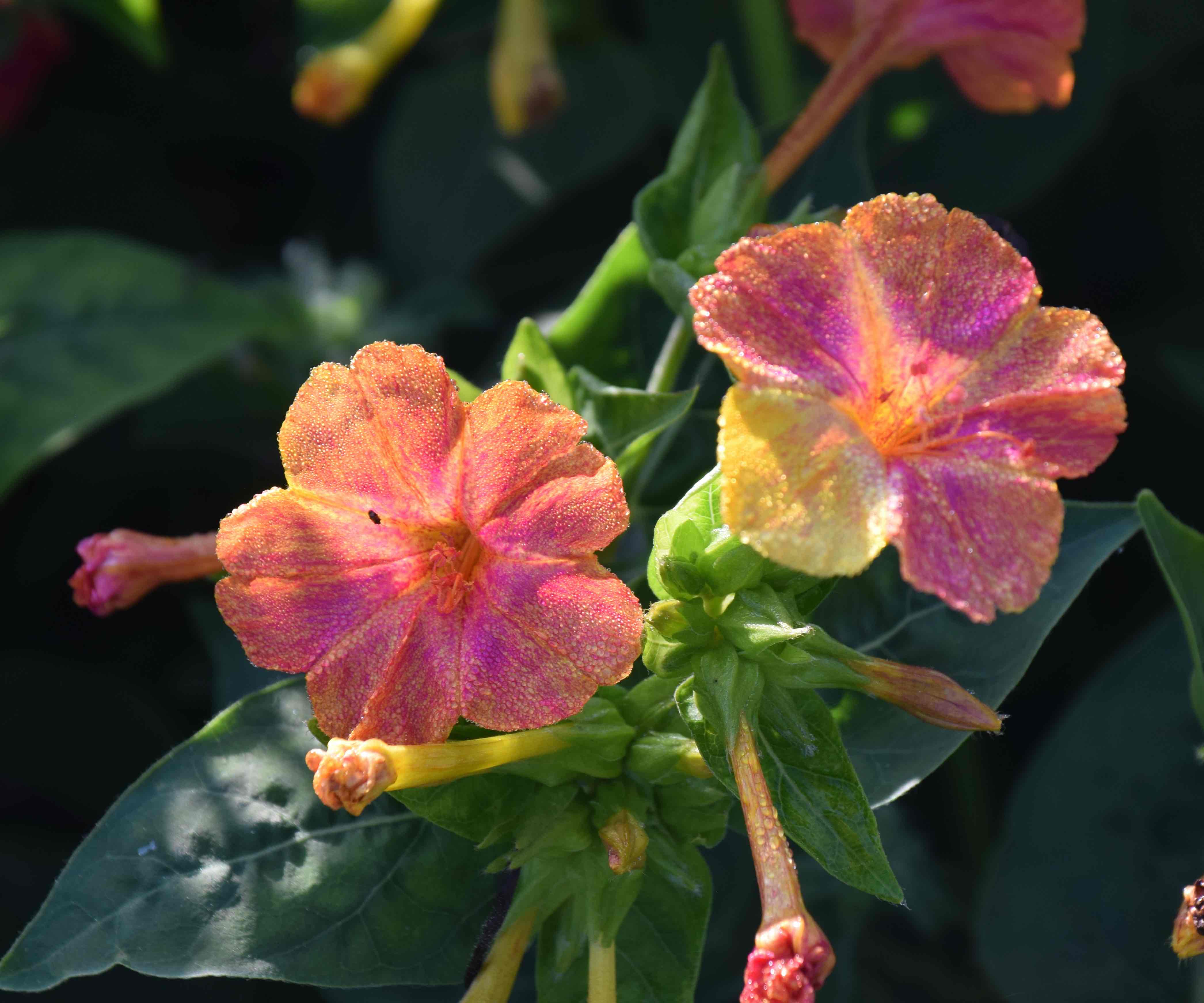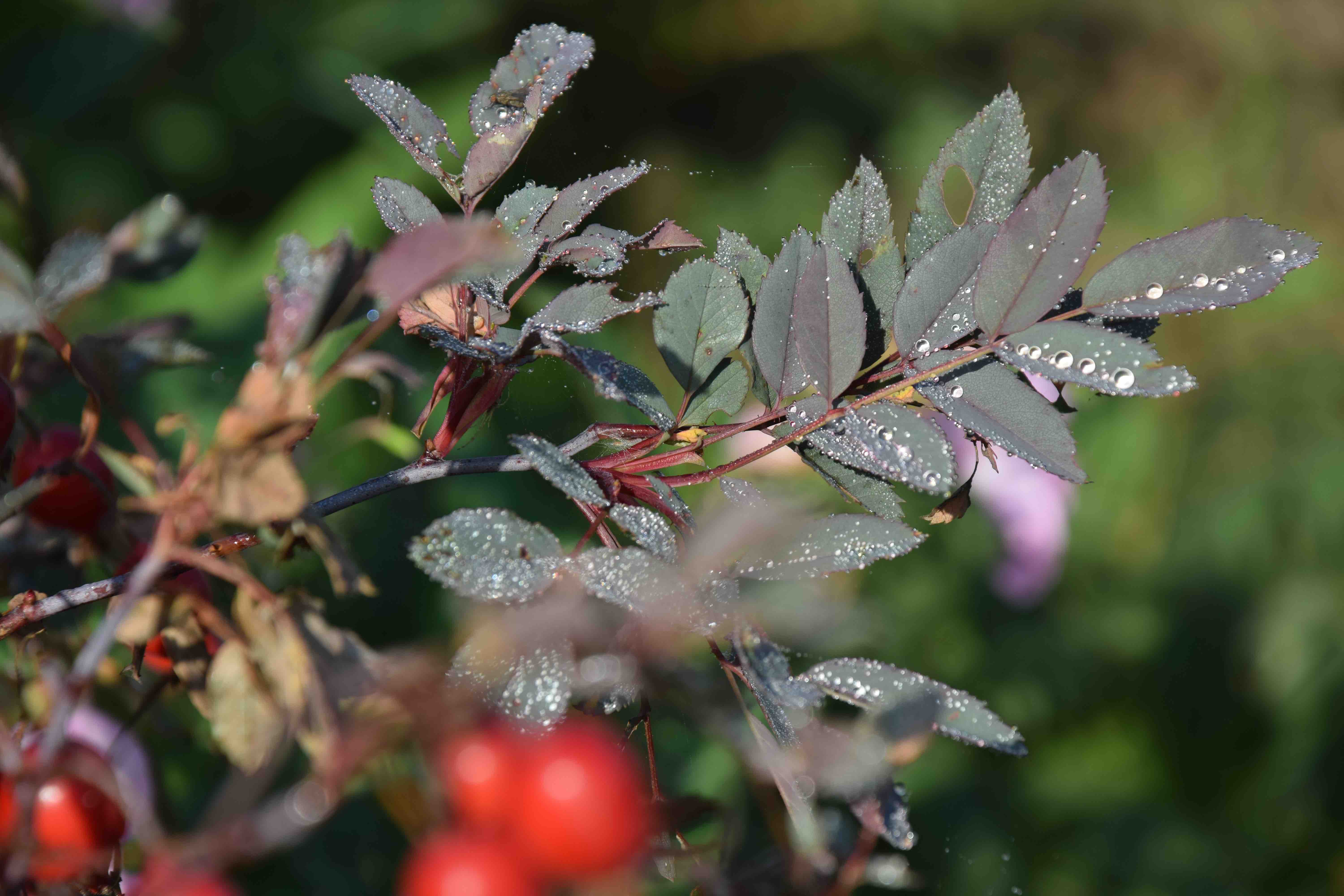 Dew was heavy and condensed on flowers and leaves, including Rosa glauca.
