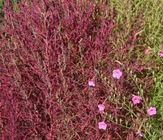 The kochia (burning bushes) are starting to change colour as the days shorten. The bright, lime green that has been so cheery all summer is being replaced by pinkish crimson. It matches the pink of the neighbouring nicotiana well.
