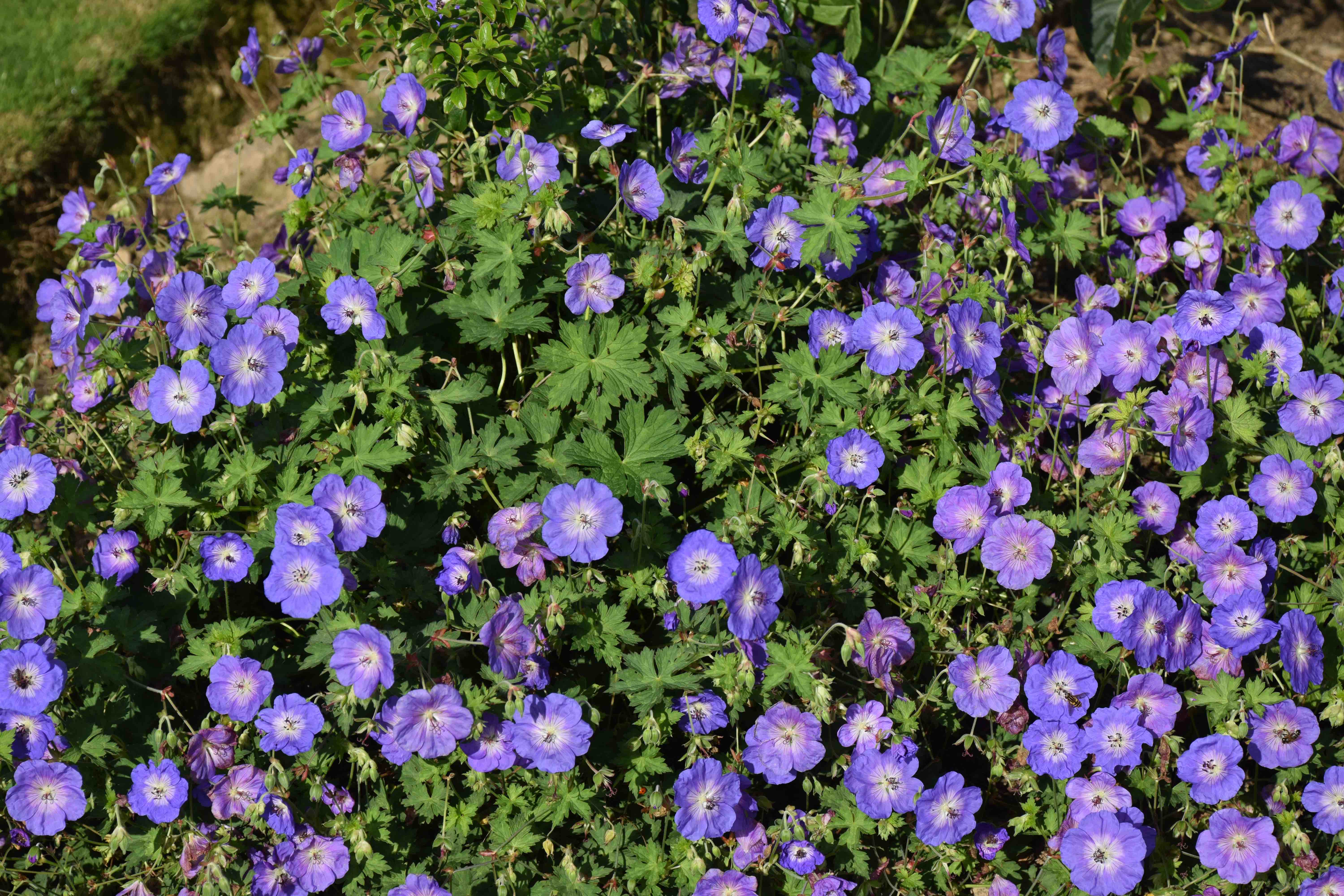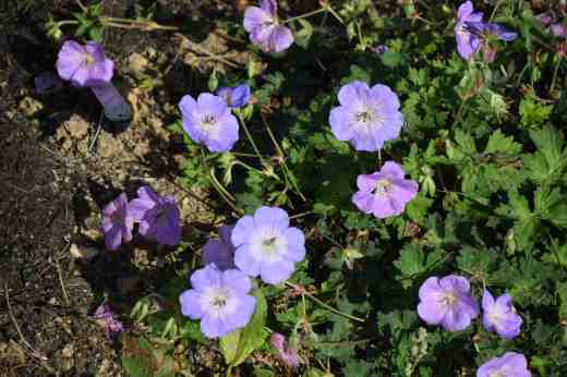 To compare the photos above, ‘Rozanne’ was planted this spring from a divided plant and is almost 1m across, and still growing. ‘Azure Rush’ was planted this spring from a potted plant and is 45cm across. They are in the same bed, in full sun, in rather poor soil.