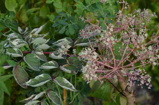 Aralia elata is a hardy, suckering shrub with huge, pinnate leaves and clusters of tiny white flowers in late summer, followed by tiny black fruits. The white-variegated and yellow-variegated forms are grafted and, being sparsely-branched shrubs, I assume that propagation material is not abundant. So plants are devilishly expensive. Twenty five years ago, on leaving a job, I had a wad of cash to spend on plants and almost bought one, but plants are always at least £80 for a stick in a pot and I bought several other trees instead.