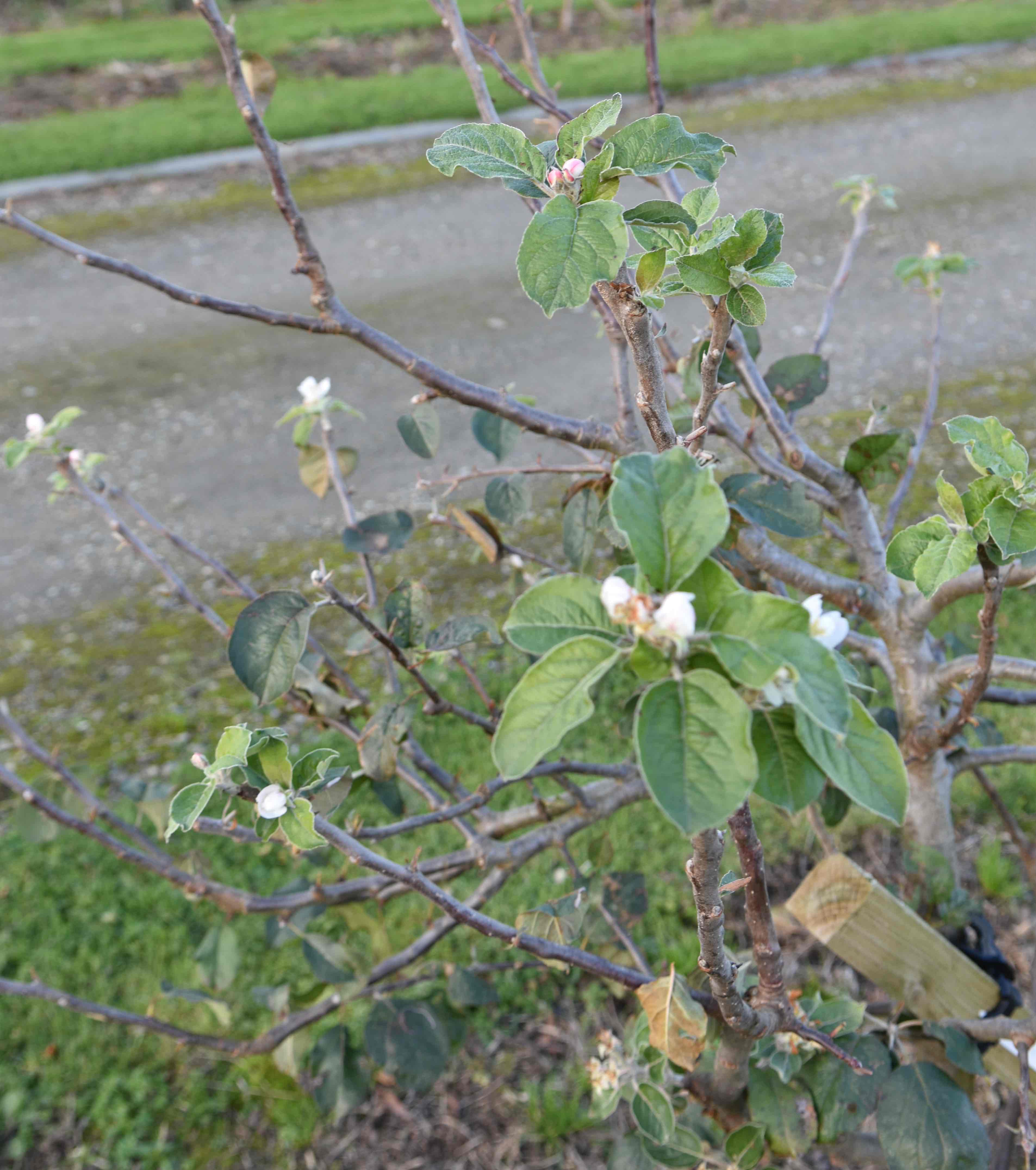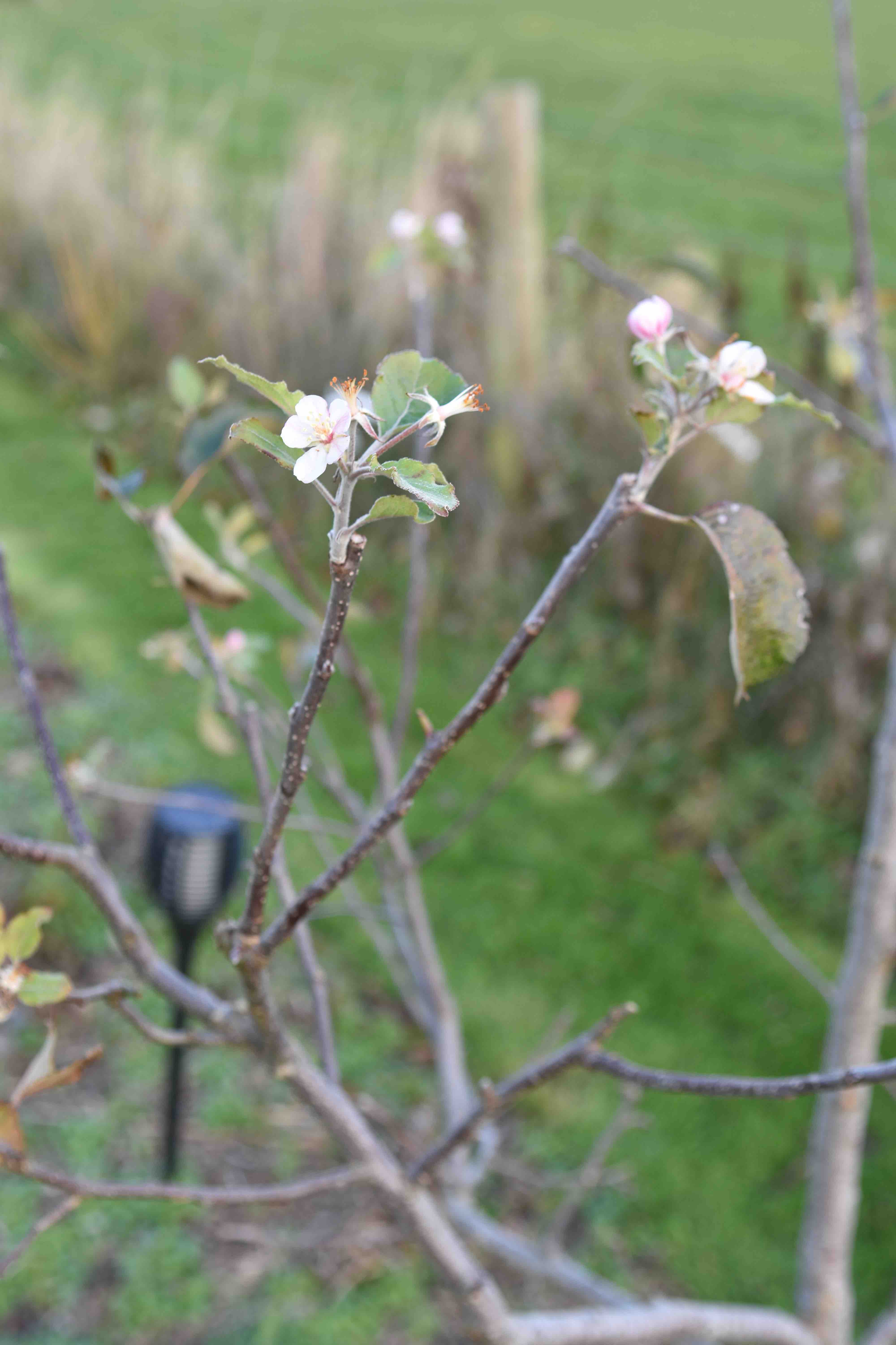 But what I find odd, is that, among my collection, that includes apples old and new, it is not just the modern apples that are doing this. Although ‘Pinova’ (1986) has been flowering on and off, so has ‘Lady’s Finger of Offaly’ (1851) which is a traditional Irish apple that should know how to behave. It has had flowers trying to open for two months. It is very strange and I might have to rethink pruning this year.