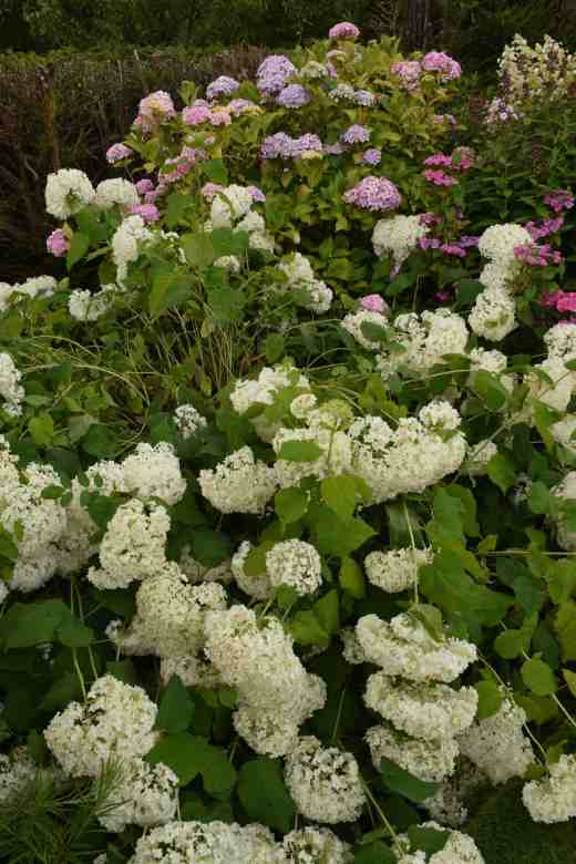 Then there are the H. paniculata (PeeGee type) and H. arborescens (such as ‘Annabelle’). These produce their large flower clusters at the ends of the new shoots, that start to grow in spring. Their growth mode and pruning, is the same as for common buddleia. So in March, all the growth produced last year is cut back, possibly to the lowest pair of buds. You can also prune less severely. The very hardest pruning results in fewer new shoots but the biggest flower heads. This sounds wonderful but the big flowerheads are sometimes too big for the plants to support and the result can be a bit floppy. If you don’t prune at all you end up with lots of dead, twiggy wood and small flowerheads. This type of hydrangea is much hardier than the mopheads and seems to do better for me at the moment. The colour range is limited – basically all start lime or cream, mature to white and age to pink – in various degrees.