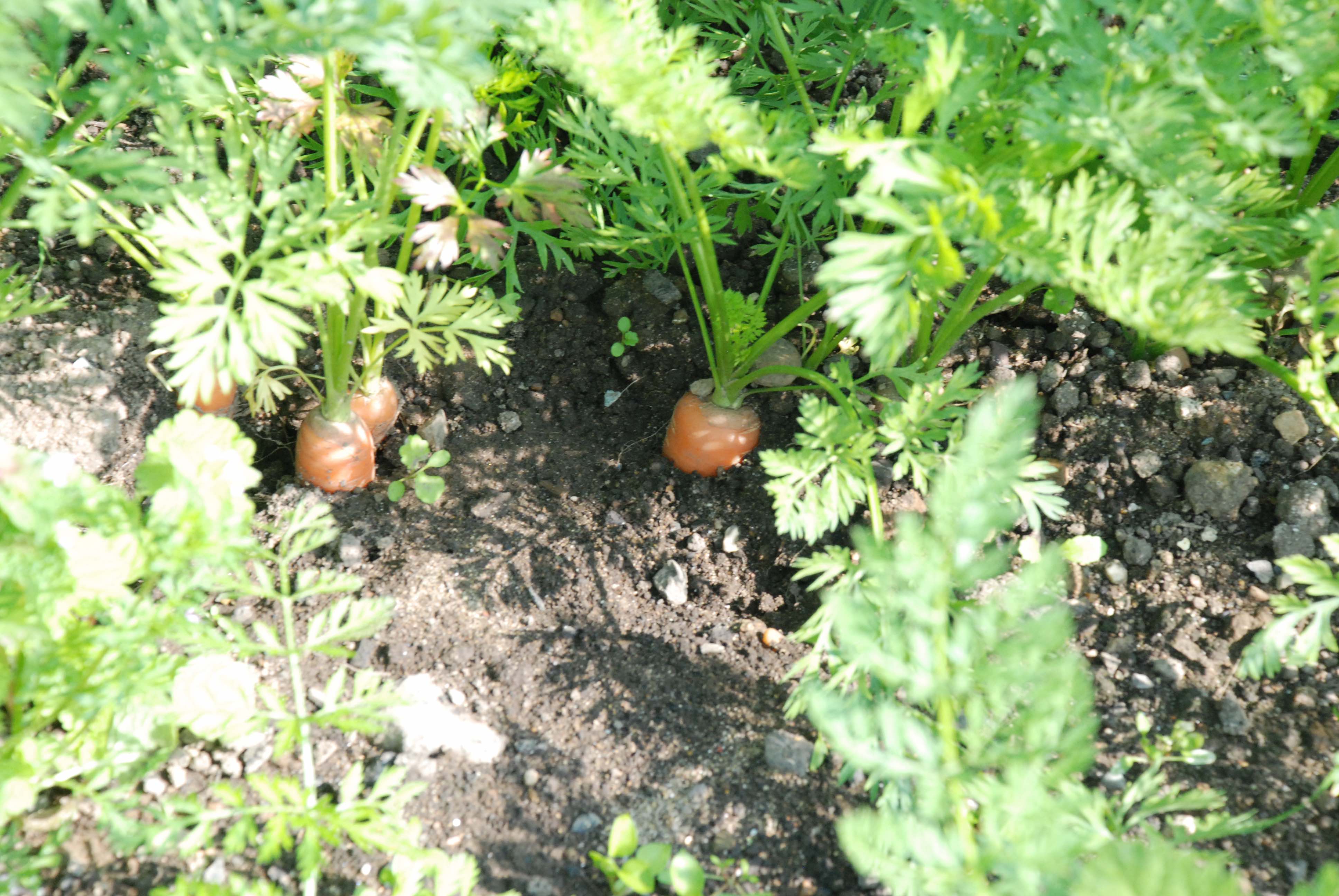 In the garden, carrots grow best in well dug, light, sandy soils. They are not great in clay soils and if the soil is full of stones it can caused misshapen roots. They must not be grown in heavily manured ground or the roots will fork or ‘fang’. Carrot seeds are light and can blow away before you cover them so it is a good plan to make a drill (shallow trench for sowing – about 1cm deep) and water this before sowing. Then the seeds will stick to the soil. It also makes sure the soil is wet so when you later water it will not just run off the surface. Always keep the area where the carrots are sown evenly moist after sowing. If the soil dries out as they germinate the seeds will die and nothing will appear.