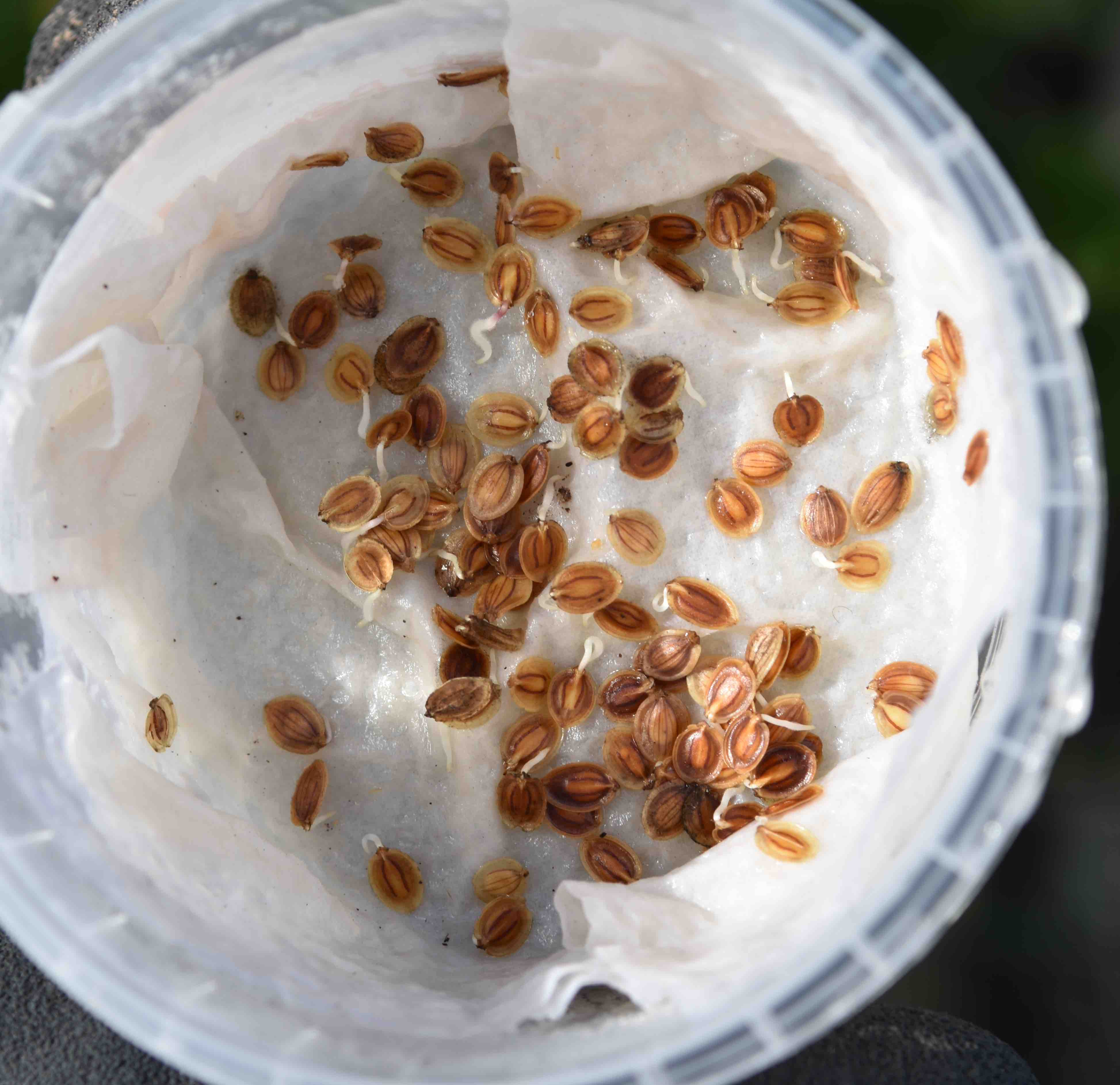 But back to parsnips, a good option is to germinate them in heat first and then sow the seeds, already bursting with life and with tiny roots showing, in the garden. There are various ways you can do this but the simplest is to use a plastic container with a lid, put some kitchen paper in this, wet it so it is wet, not just damp, but not sitting in a puddle of water, and scatter seeds over this. Put the lid back and place it somewhere warm (above 15c). Keep an eye on them and lift the lid slightly, as you would when microwaving something, when you see the first signs of roots emerging. Then, before they get too long, you can plant these individually in rows in the garden.