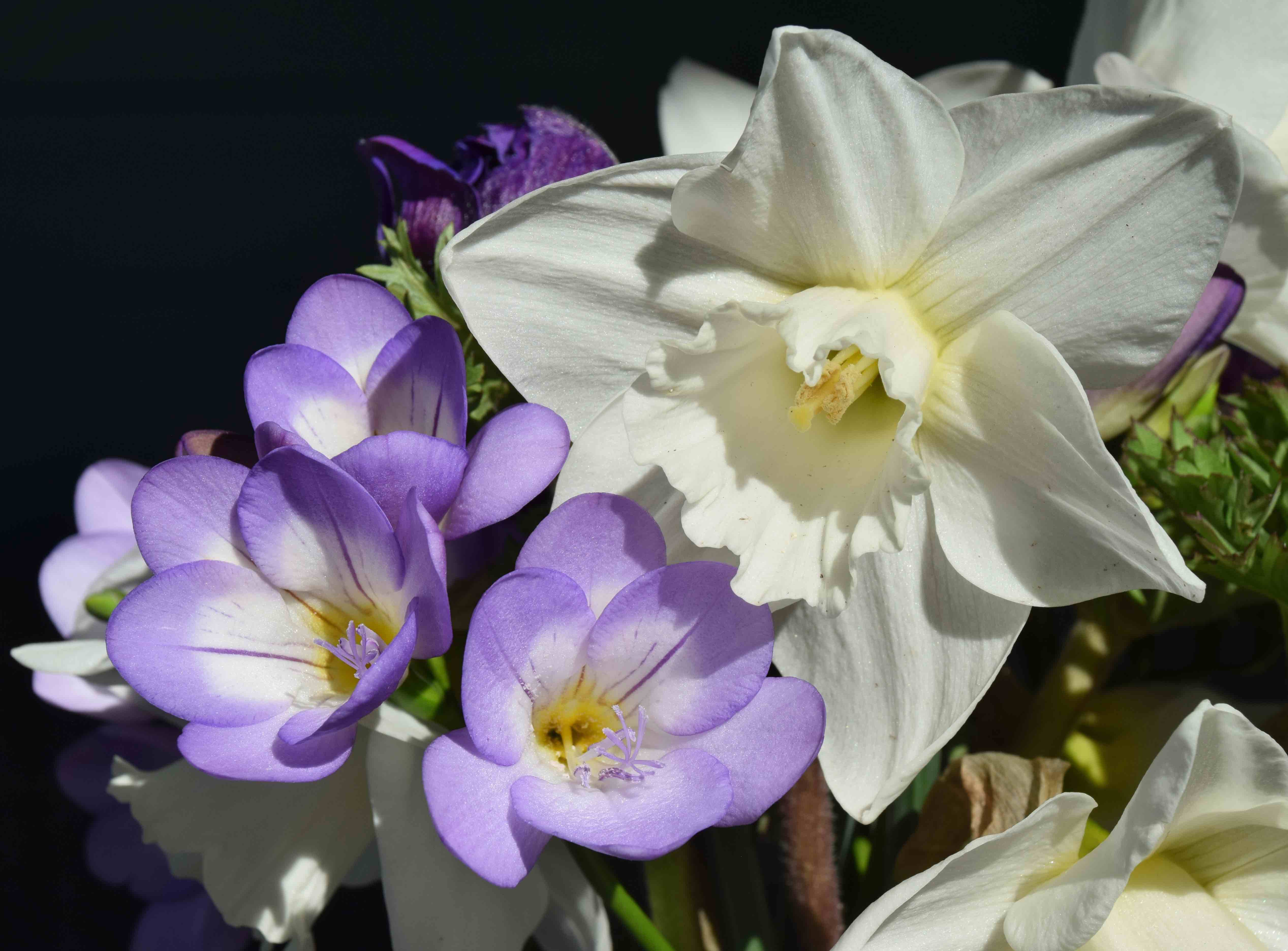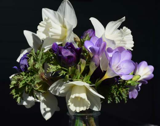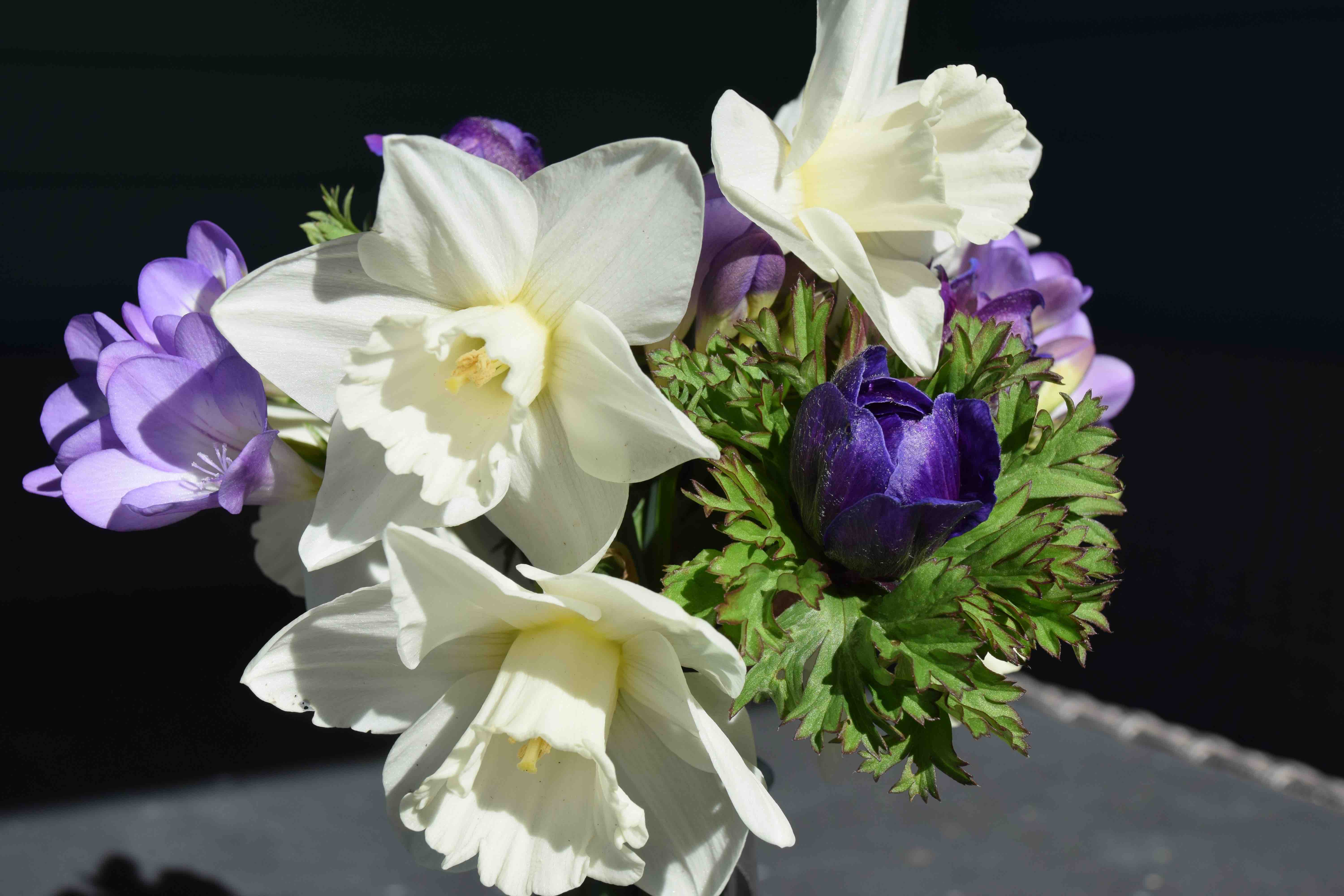 Yesterday the sun shone and it didn’t rain. So I picked some ‘Love you More’ daffs, some purple anemones and some freesias (from the greenhouse).