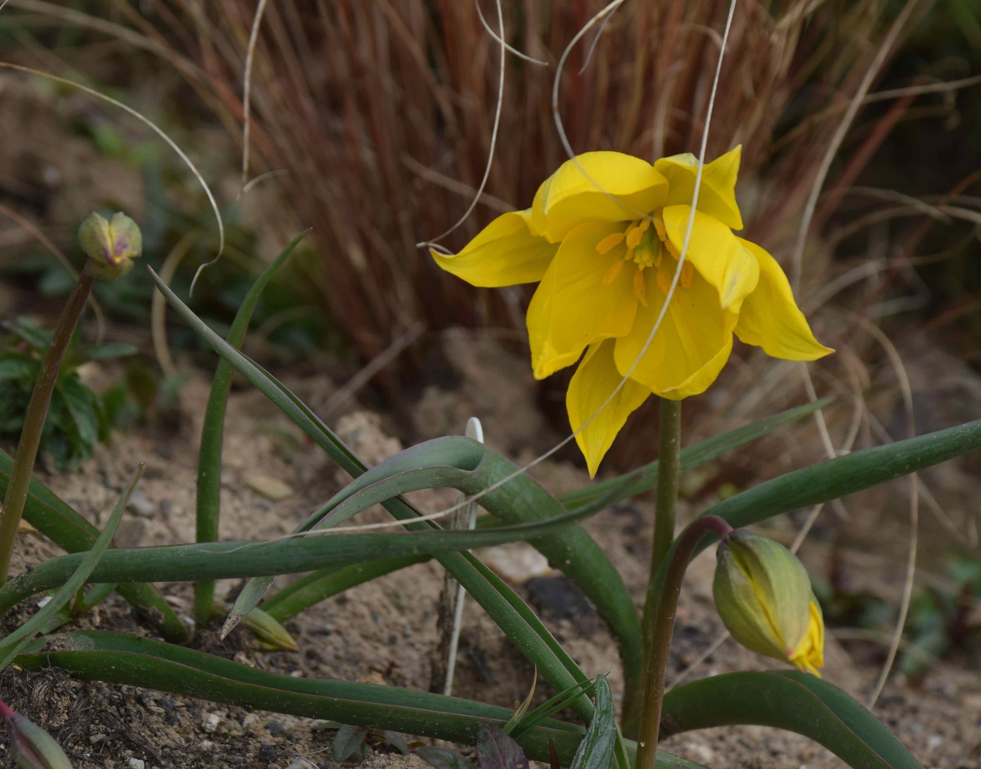 Higher up the bed, among bronze Carex comans, Tulipa sylvestris is blooming. This has the most westerly natural distribution of any tulip, being native to Spain and Portugal, possibly France and then east to China. It is probably not native to the British Isles but has been naturalised there since the late 17century. I managed to naturalise it in the grass at the last job, where the soil was quite sandy. Perched high here, I hope it will be happy because I like the pure yellow flowers. They are nodding in bud and the outer tepals have recurved tips that add to the elegance of the flowers. The flower above is from a strong bulb and has four-merous flowers rather than the usual six tepals.