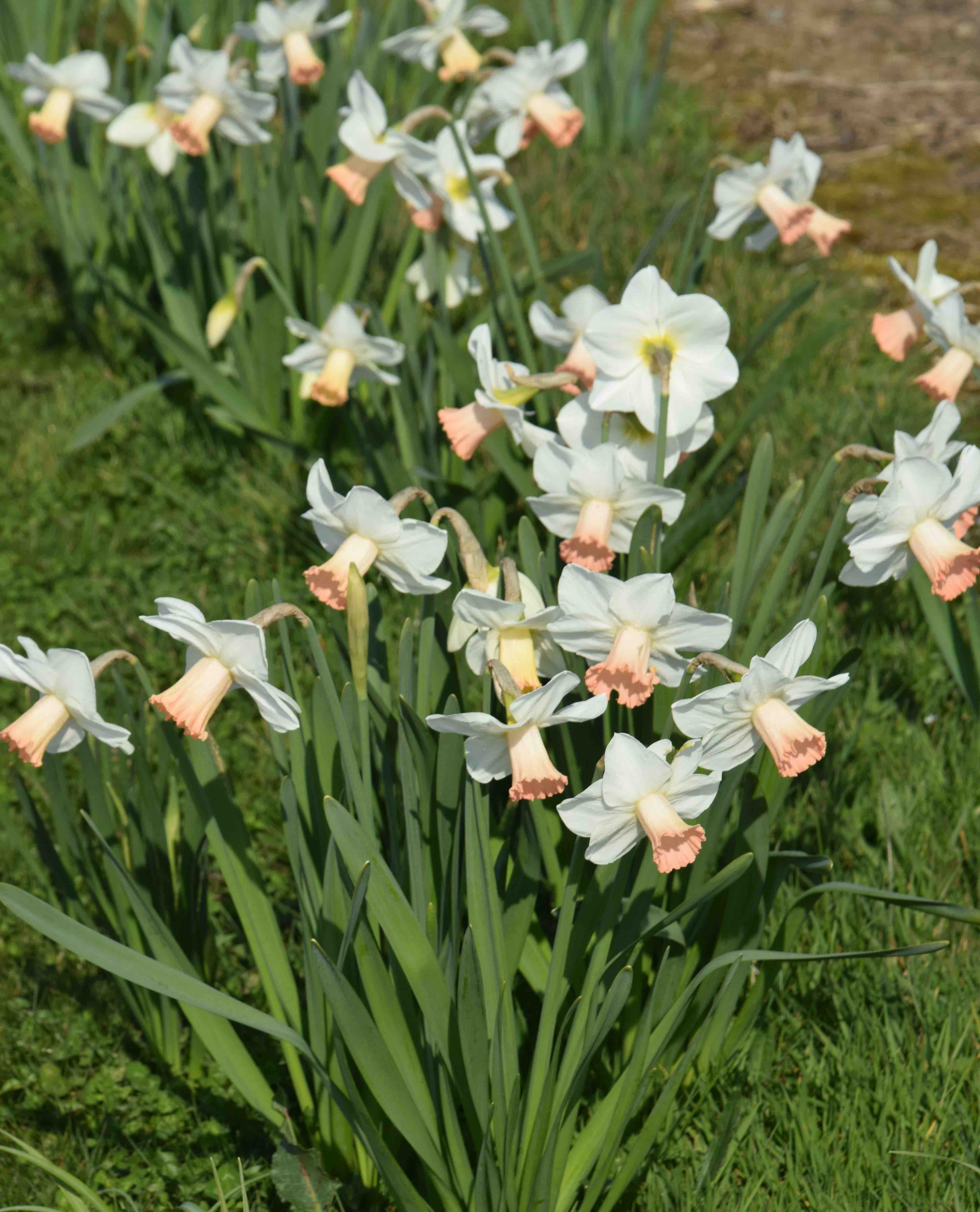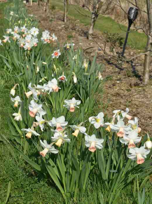 I broke one of my basic rules when planting the daffs down the drive. I always think that small, yellow daffodils look best in grass and that very ‘fancy’ varieties are not good for naturalising. So it was a bit odd of me to choose pink and white daffs to grow in the grass. But I did avoid doubles and did choose five or six varieties and not a random mix. The result has been OK. Some varieties have done much better than others and ‘Skype’ (below) with its slightly recurved tepals (2013, Karel van der Veek) has settled in really well. I confess that the whole display would be a lot more showy if these were all yellow and the white and pink is a bit subtle.