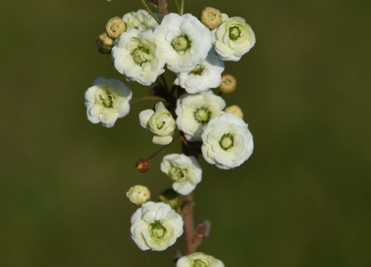 The flowers are small, about 8mm across and are pure white, with many concentric rows of white petals. I think they look like tiny roses. They are unscented. The blooms are in small clusters of three to six. The centres retain a green tinge. With most spiraeas it is the sheer number of flowers that makes them so attractive and useful but I admire every single bloom on this hardy shrub. Of course the flowers are not useful for insects but then the bees and go and feed on my honeyberries which they are studiously avoiding at present. These flowers are for me.