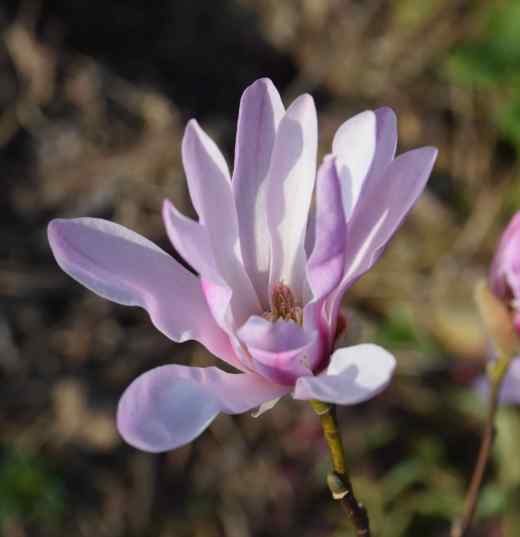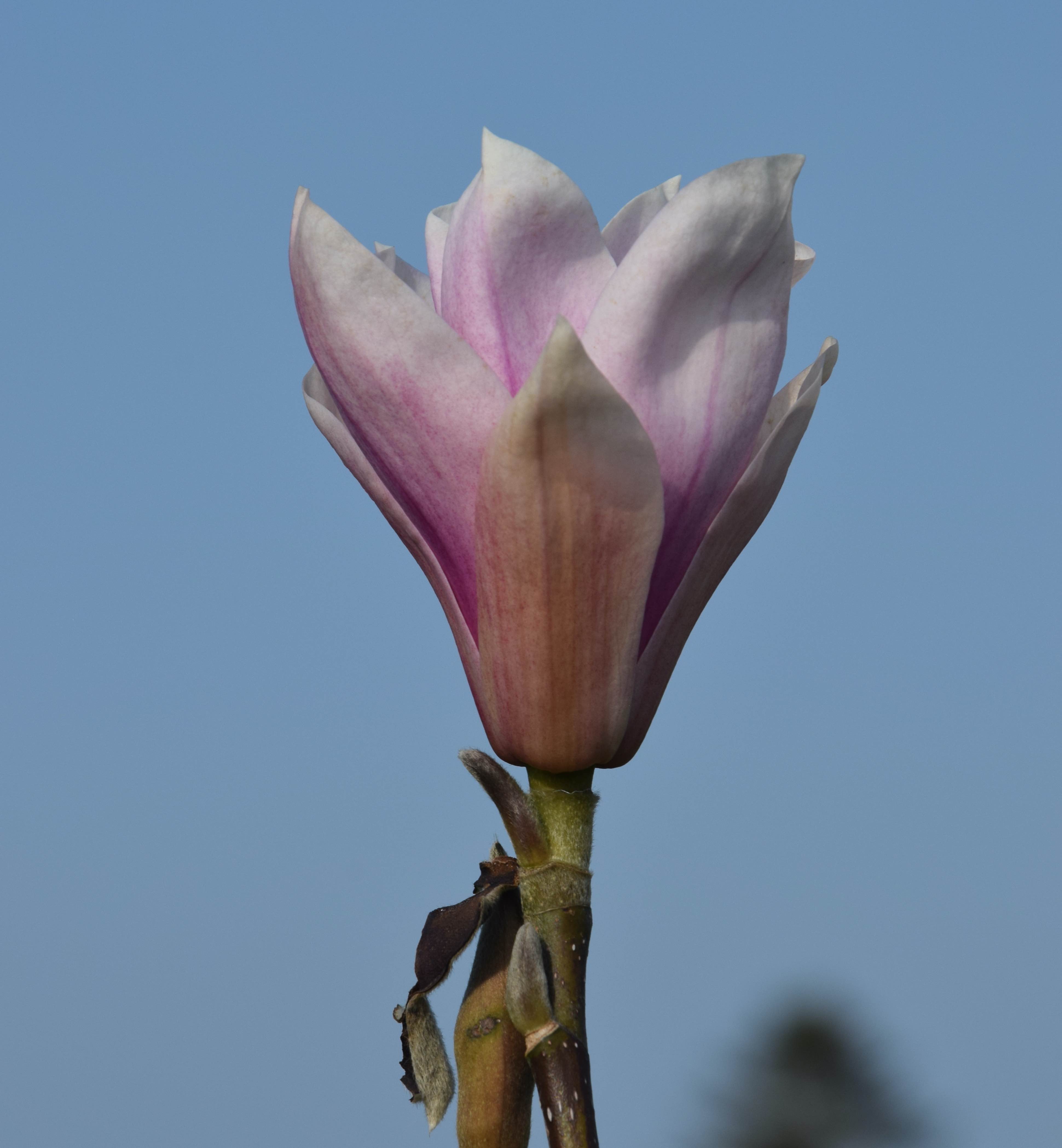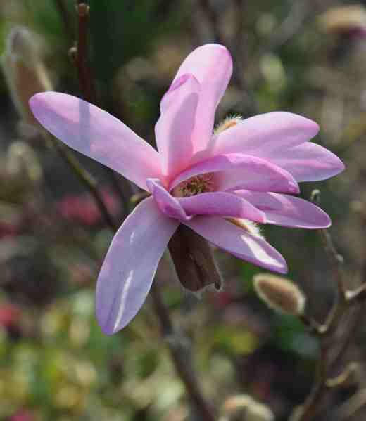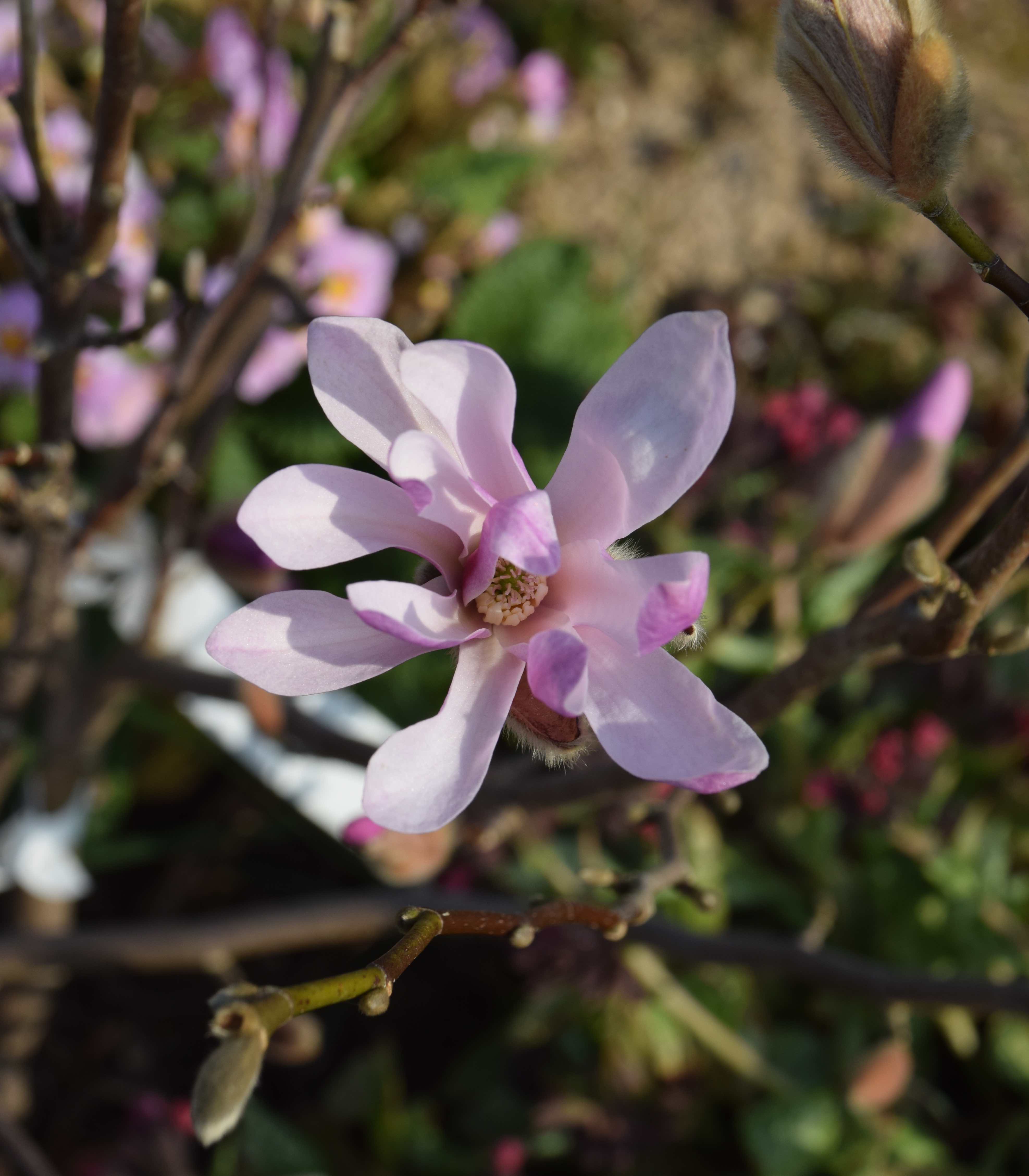 My plant is just as lovely and the petals are slightly wiggly as they start to expand. They straighten as they mature and the petals are deep pink on the exterior and much paler inside. Magnolia x loebneri is the name given to hybrids of M. kobus and the similar but more bushy M. stellata. The flowers are usually white and the cross was first made by Max Löbner of Pillnitz, Germany, just before World War I but it has been repeated and at Nymans in Sussex M. kobus was crossed with M. stellata f. rosea. The result was this marvellous pink magnolia. It has an RHS AGM and is a multi-stemmed large shrub or small tree that will reach about 4m high. As such it is exciting to think that it may become a spectacular large show of pink but is manageable in small gardens too. The buds tend to open over an extended period so if some flowers are frosted there are usually more to open.