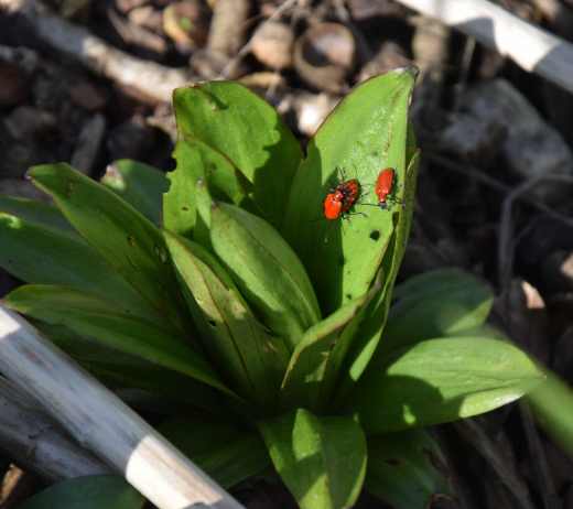 OK. Let’s get the bad news out of the way. Lily Beetle! I hate the little blighters. All summer I make an effort to control them so I hope that none of the poo-covered larvae will mature and spend the winter cosy underground. But this spring I have been horrified by the appearance of the red devils as soon as the first lily foliage appeared through the soil. Not just a few but dozens of the things – and all intent on making dozens more! The creepy little things move slowly but drop off as soon as you try to get hold of them and, at this stage in the lily’s growth they fall into the base between the leaves and are impossible to get to.