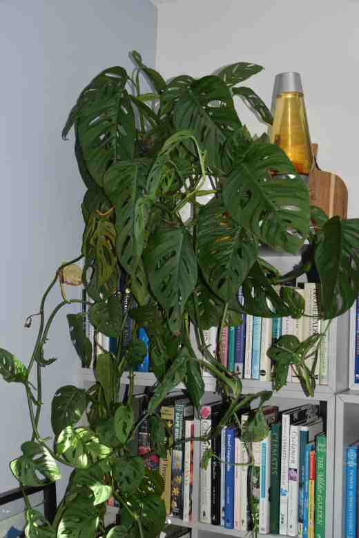 This is a very different plant, although the leaves also have holes, thought to be a defence against wind damage. The leaves are smaller (up to 20cm long) and narrower. They are also softer-textured and paler green and less lustrous. It can climb and produces lots of aerial roots along the stems. These are a problem in the home because they will ‘stick’ to walls, ruining paintwork (I know!). It can be trained up moss poles. But because it branches freely, especially when cut back, and has slender stems, it is also happy as a trailer. I have had my plant four years and it has been moved many times.