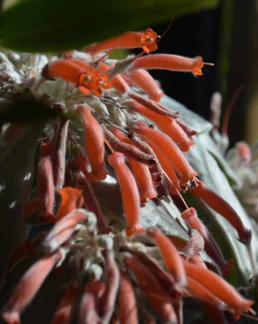 It is a curious plant that forms a large tuber. This sits on the soil surface and has a large, hollow, upper surface. From this grows short stems that do not branch and have four large, silky leaves at the end. A tuber will make a few or many stems. My plant usually only produced a couple of stems but last year I paid it more attention and I am rewarded with five stems this year and I promise I will give it more attention from now on – after all, you all know I have it now. At the top of the stems arise masses of scarlet, thin, tubular flowers. These are pollinated by birds in the wild and are full of nectar. This can be an issue in the home when the flowers drop and nectar gets on furniture but I can cope with that.
