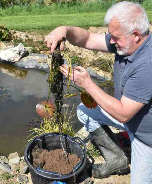 The waterlilies have been in their initial baskets for 30 months, having been bought as bare root cuttings in August. At this stage they need moving into larger baskets and they will go into the large pond. They have been fairly happy, in pots almost touching, in the small pond for two years. Lilies have different growth habits and some are neat and form clumps. They are going to be easy to repot. But others produce long rhizomes and these are more of a problem to tackle. This is partly because these rhizomes get tangled with surrounding plants and the long, white roots from these root into the debris at the bottom of the pond. It is a messy and smelly job. I should state that there are no frogs in the pond at present. There are fish, that came in as eggs with the plants. Six reached maturity and they disappeared for a few weeks recently and I thought a heron had had them, but I think they were just canoodling in the pond weed.