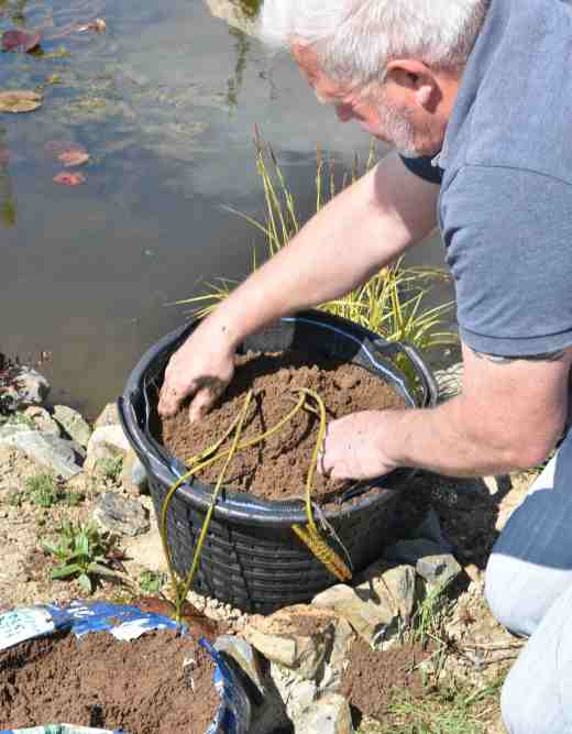 I am also adding a few marginals in shallow baskets. These are important to allow access and cover for creatures entering and leaving the pond as well as being attractive.