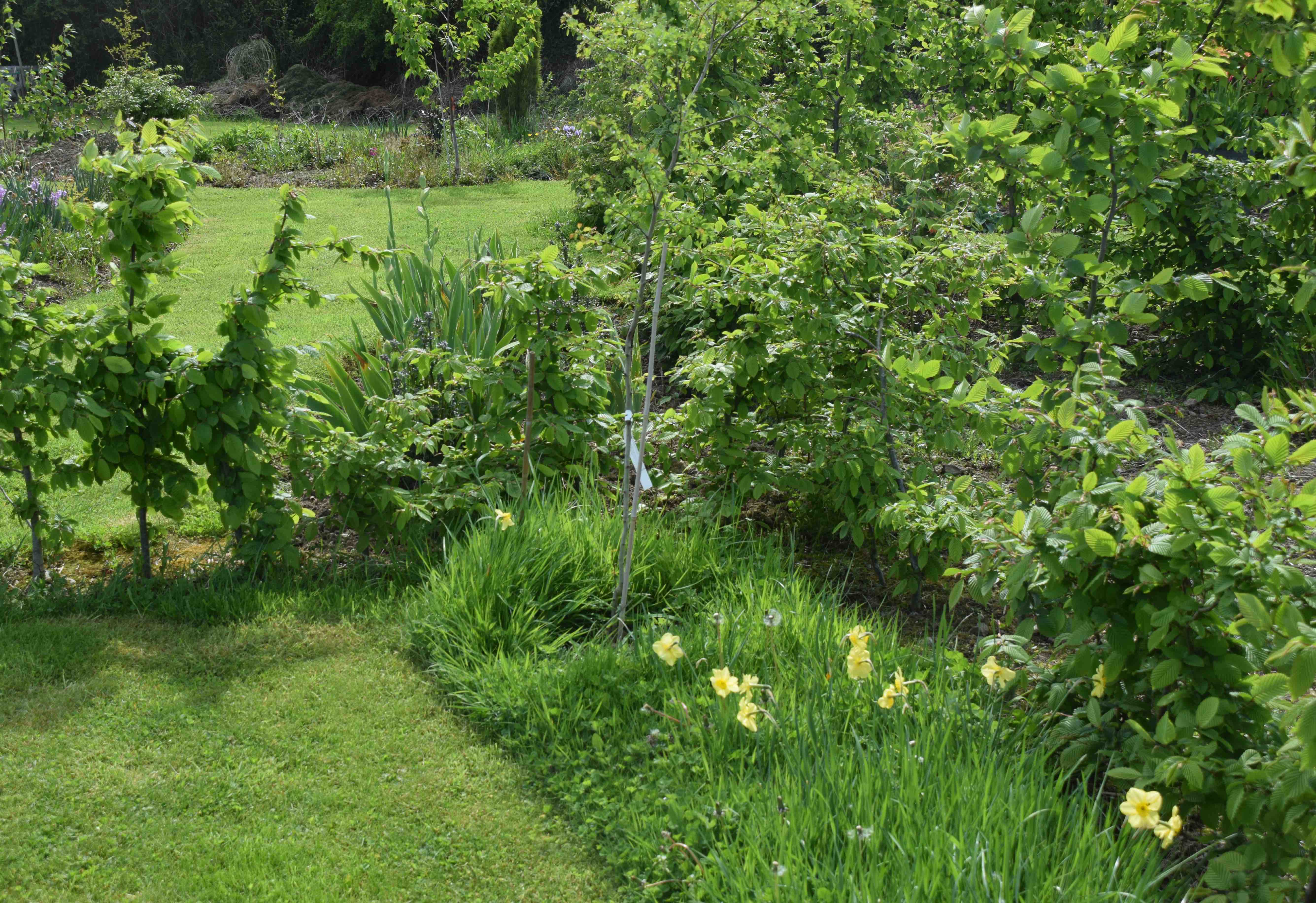 Elsewhere, lots of plants are growing too and the hornbeam hedges are greening up and look really fresh. Two strips of long grass are speckled with late daffodils. The soil here is wet in winter and most of the daffodils have disappeared but a few remain – too many to give up on them and mow them off but not enough to make a show. But I suppose the long grass is helping wildlife, along with the dandelions.
