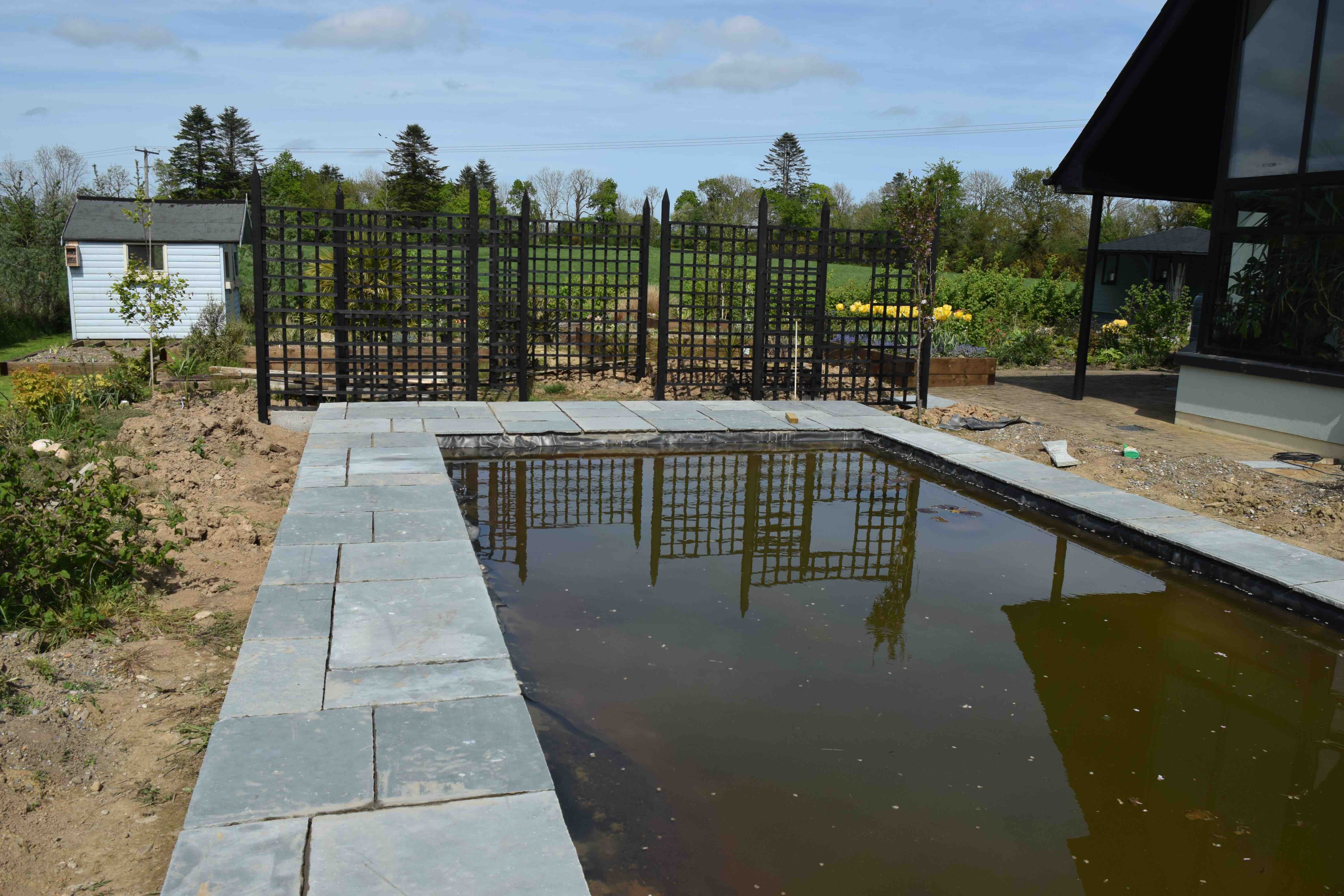 It seems to have been a busy week, helped by some lovely weather. With no threat of rain or frost it has allowed us to get on with the paving round the pond with a big push yesterday to get three sides complete – apart from the pointing. This is a huge relief, apart from actually getting it done, because I can now try to level, dig and prepare the soil for some planting – the greenhouse is full of plants to put out. The trellis is all up too and painted. The grass is growing like crazy and has been cut twice this week and looks like it will need doing again in a couple of days.
