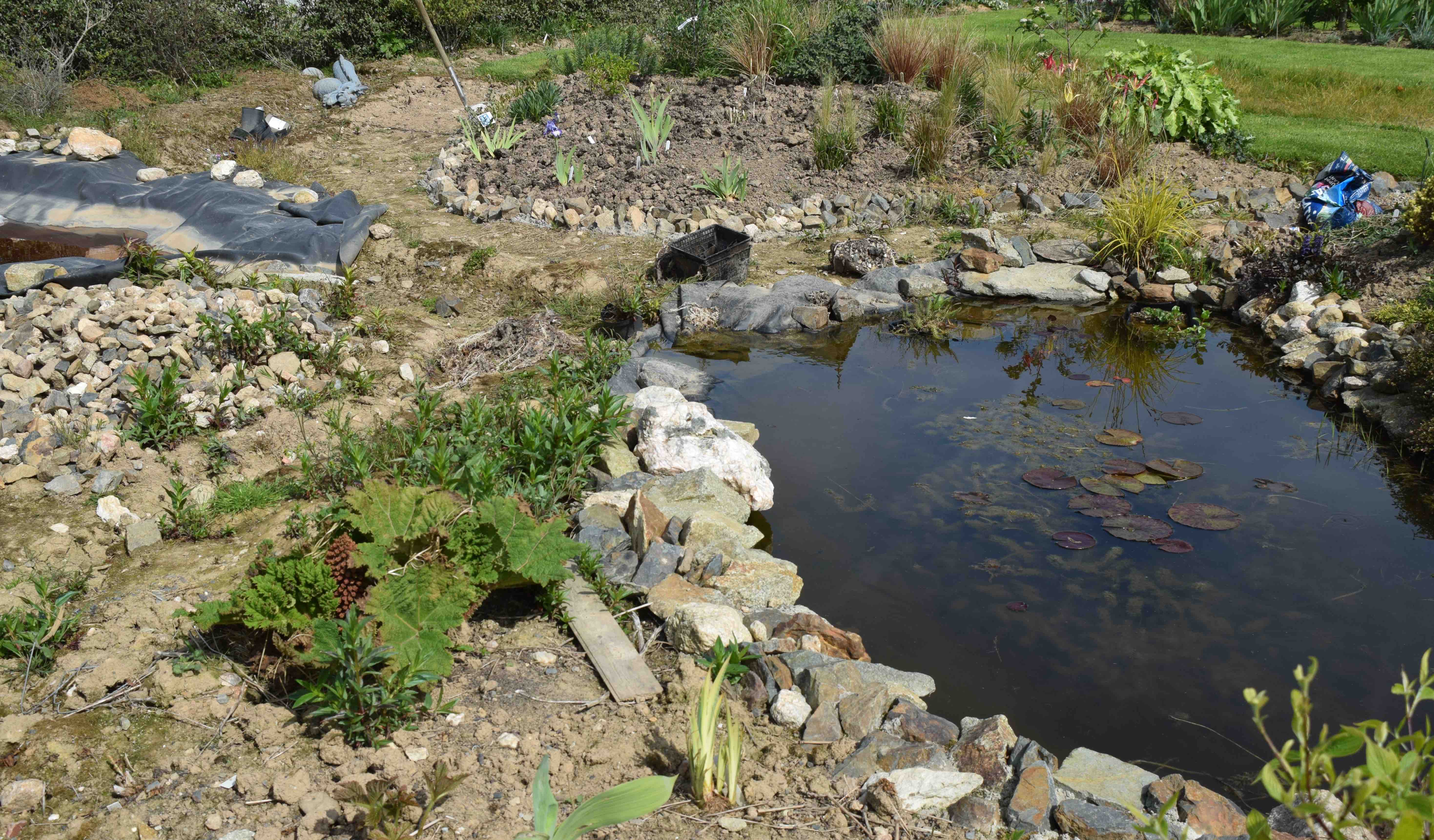 Still needing a lot of work, the two lower ponds need to be completed and joining up with the big pond and the pump to be installed but we are getting there slowly. The bed at the rear is now edged and planting has started.