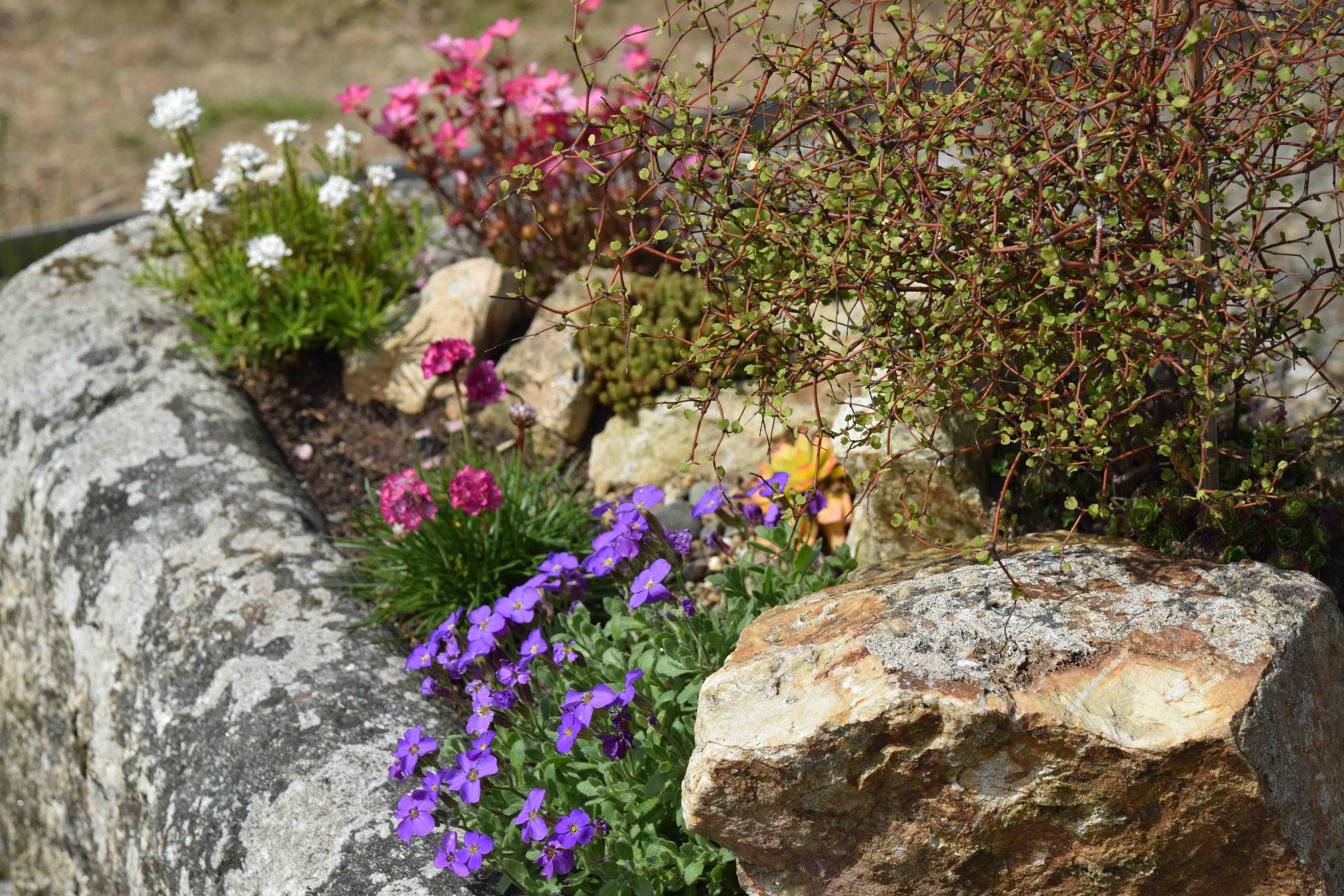 The stone trough is looking colourful too. I had to make some big changes to this. The small prunus was removed because it had bacterial blight and I was not prepared to tolerate that. The saxifrages looked sad too and, after investigation, I discovered that the roots were full of vine weevil grubs. I must have bought these in with the plants and I decided to remove the plants and as much soil as possible and replant the lot. I could not get ‘fine’ alpines that the trough deserves and had to buy what was available and although these are common plants they look attractive and can always be moved later.