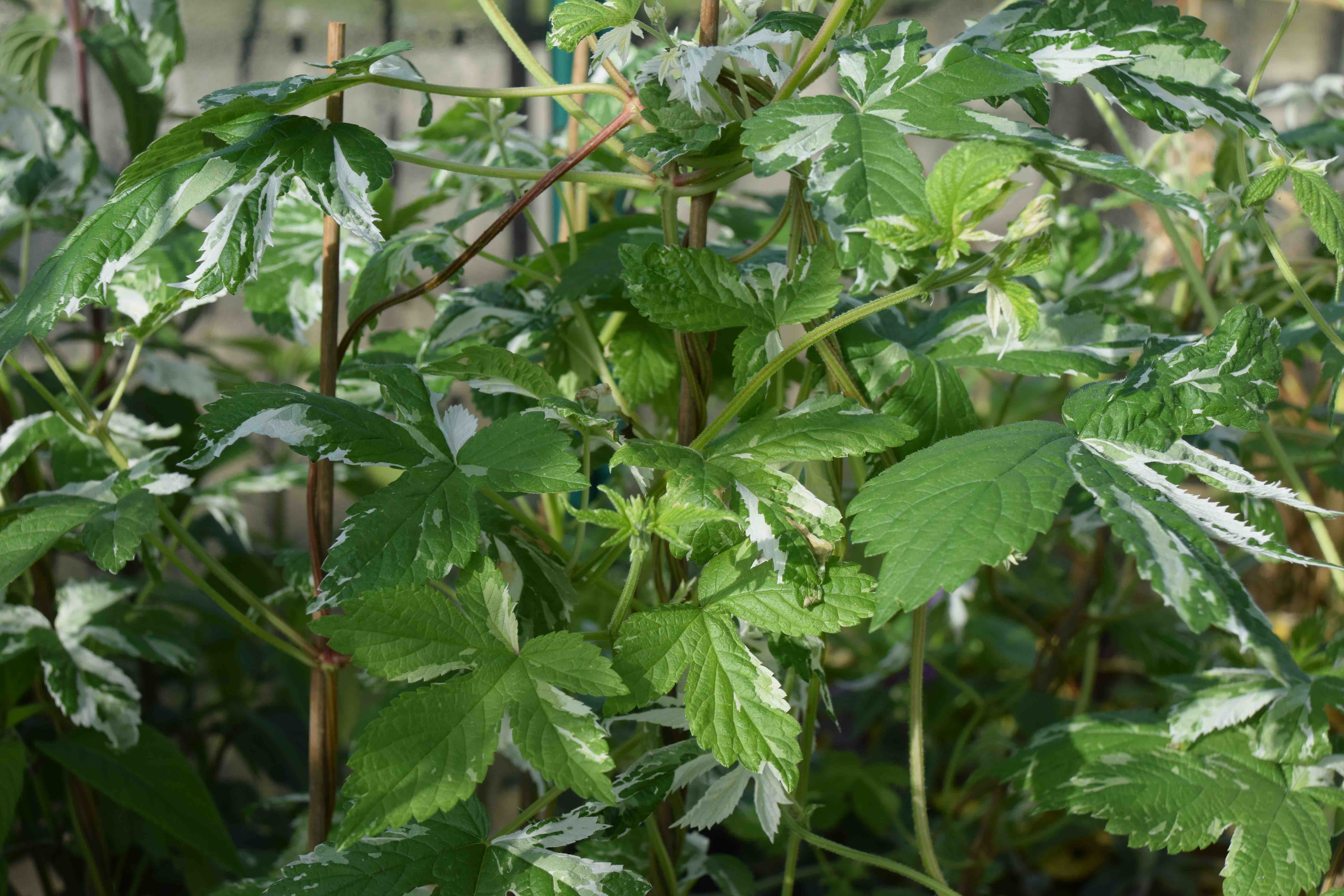 The variegated, annual hops, on the other hand, need to go out soon. In fact I have put them outside to harden off. I love this plant for its splashed foliage and it is a vigorous climber. The stems are rough and grab hold of anything passing – one reason I am pleased they are no longer on the bench because it was getting annoying while watering.
