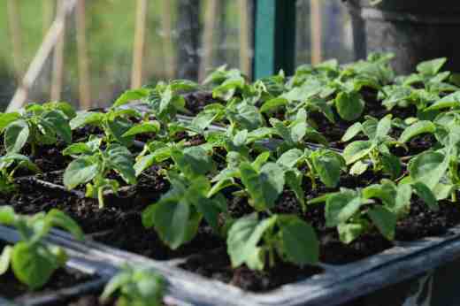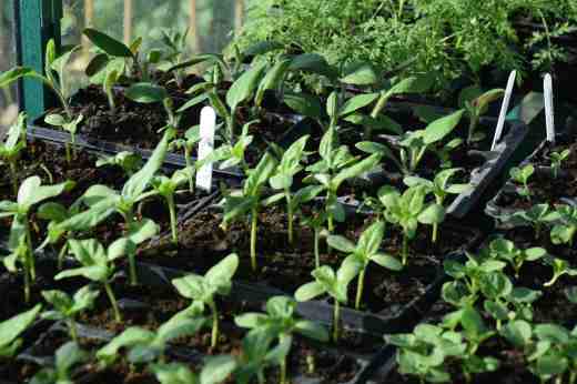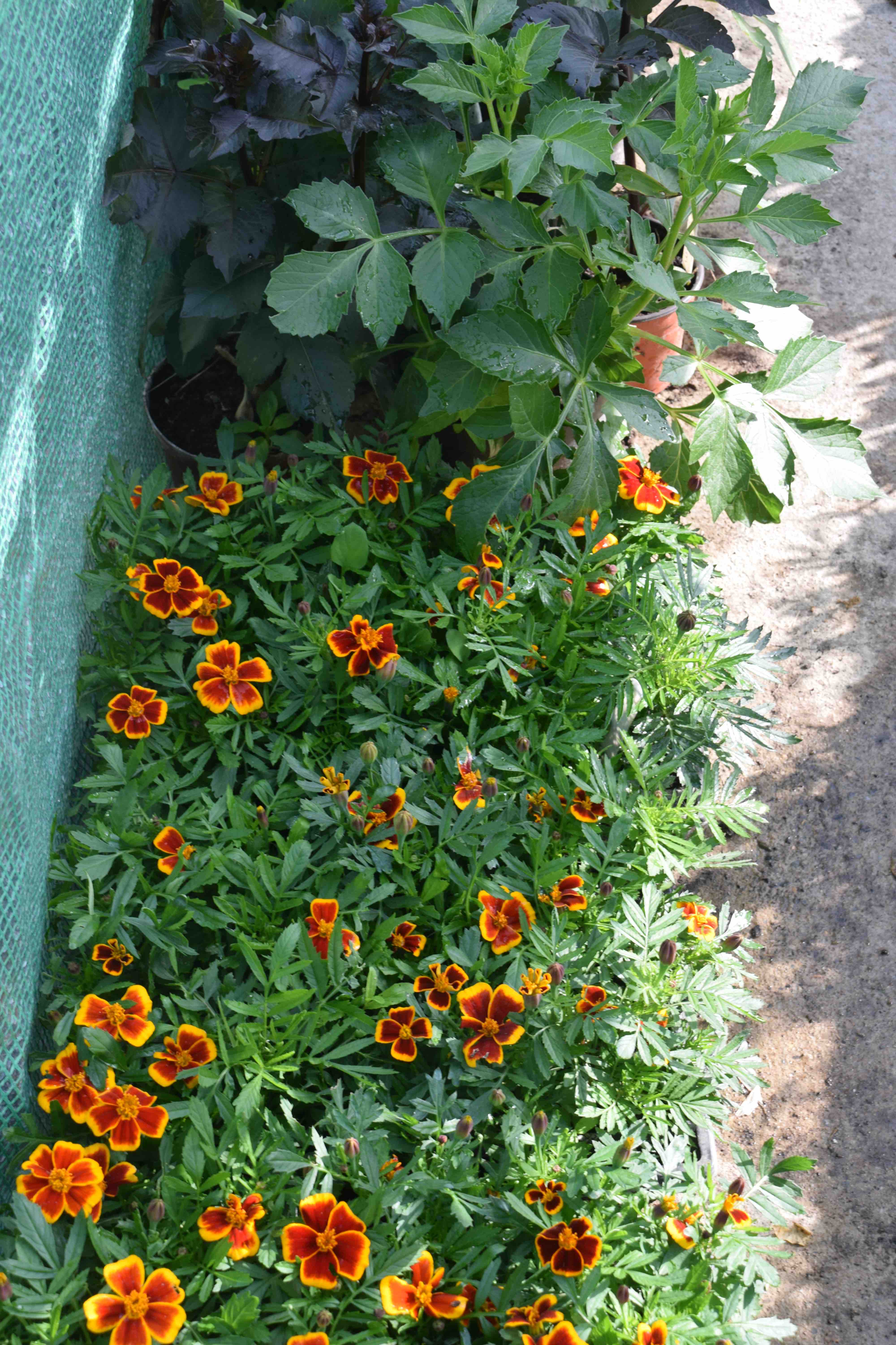 One batch of marigolds (‘Red Marietta’) was sown rather early and are now ready to go out. Some have been planted but some more remain, waiting for me to get the beds ready. When I plant them out I pinch off the flowers so the plants make efforts rooting and growing rather than producing seeds. But I am too fond of a bit of colour in the greenhouse to take them all off now – though I should really.