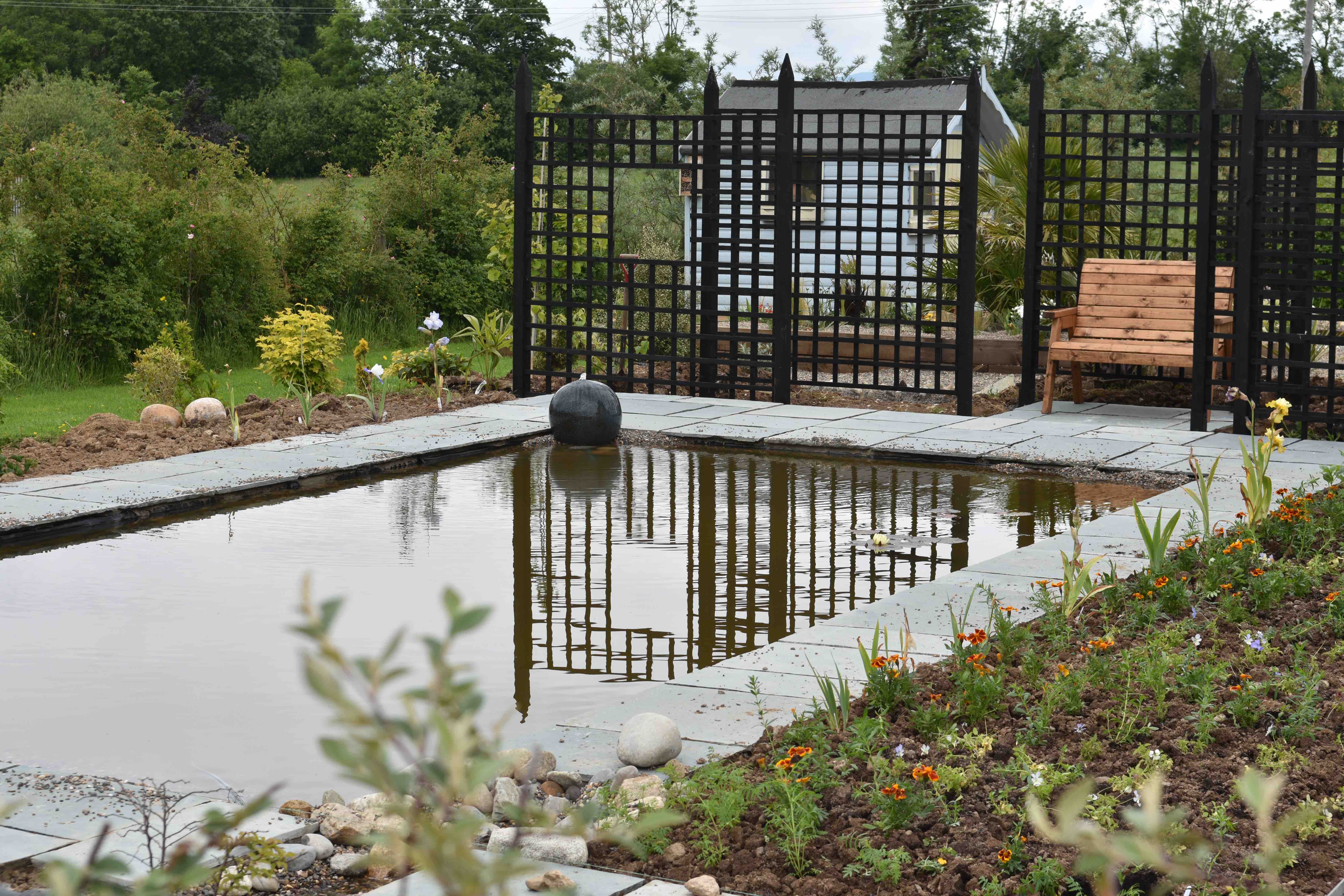 But there has been some garden work. Because I couldn’t bear to be in the house with all the banging I have been out doing lots of weeding and planting and the greenhouse is, finally, almost empty. The ‘beds’ beside the main pond are dug over and filled with plants. It is a compromise for this year, with what is available, but it is done for the summer. The pump is in and working and the little bubble globe works. It will be a busy week ahead; the ponds still need more work, there is more paving and the stone for the drive arrives next week (all 45 tonnes to be spread) but the end is in sight.
