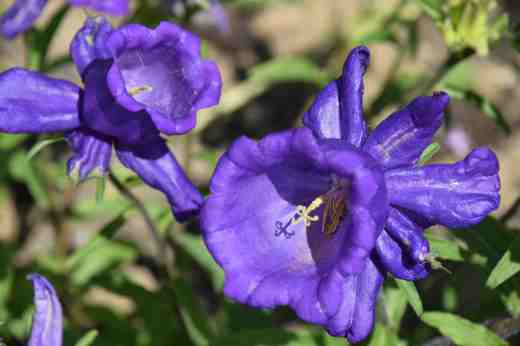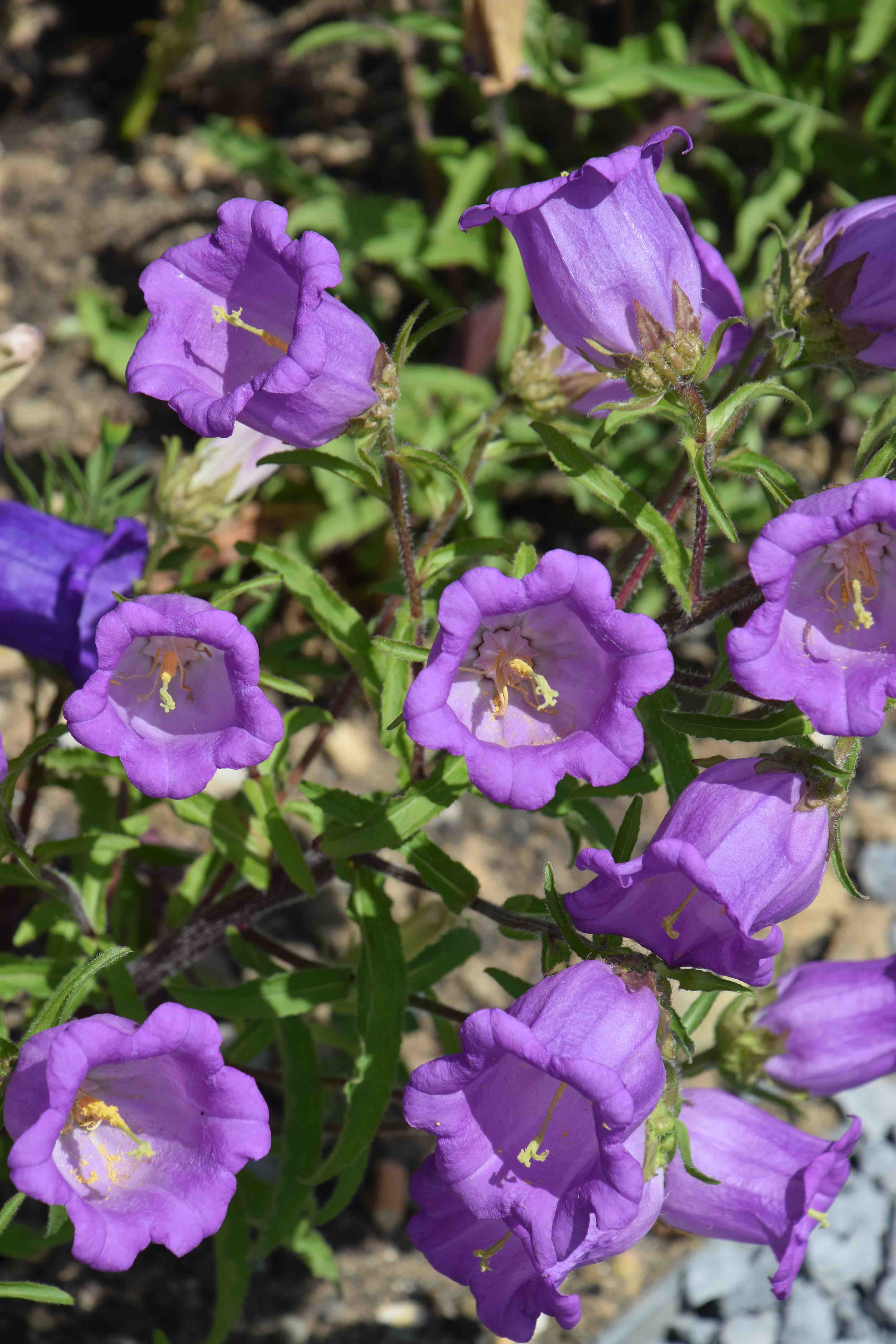 Campanula medium is a European species that is a biennial. In the first year it makes a rather undistinguished rosette of narrow leaves. In the second spring it sends up a main spike and many secondary stems, set with huge flowers. Though purple/blue is the common colour they can also be pink or white. It is a typical cottage-garden flower and very old fashioned.