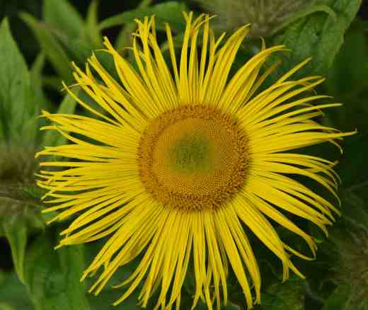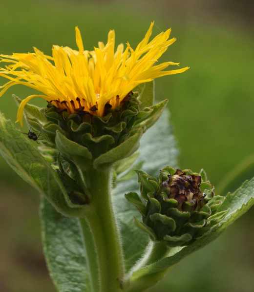 All inulas are native to Europe (generally) east into Asia, and need a sunny spot though they are not fussy about soil. Inula magnifica is clump-forming but some can be invasive. The bracts of this species, around the flower head, are thick and leafy and the buds resemble an artichoke (cynara). I must admit that it seems, on paper, to be similar to I. helenium and I am now pondering if I have the right plant. Whatever it is, as soon as flowering is over the plant is unsightly and old flower stems must be cut down and it is wise to have something in front of it to cover the dying leaves.