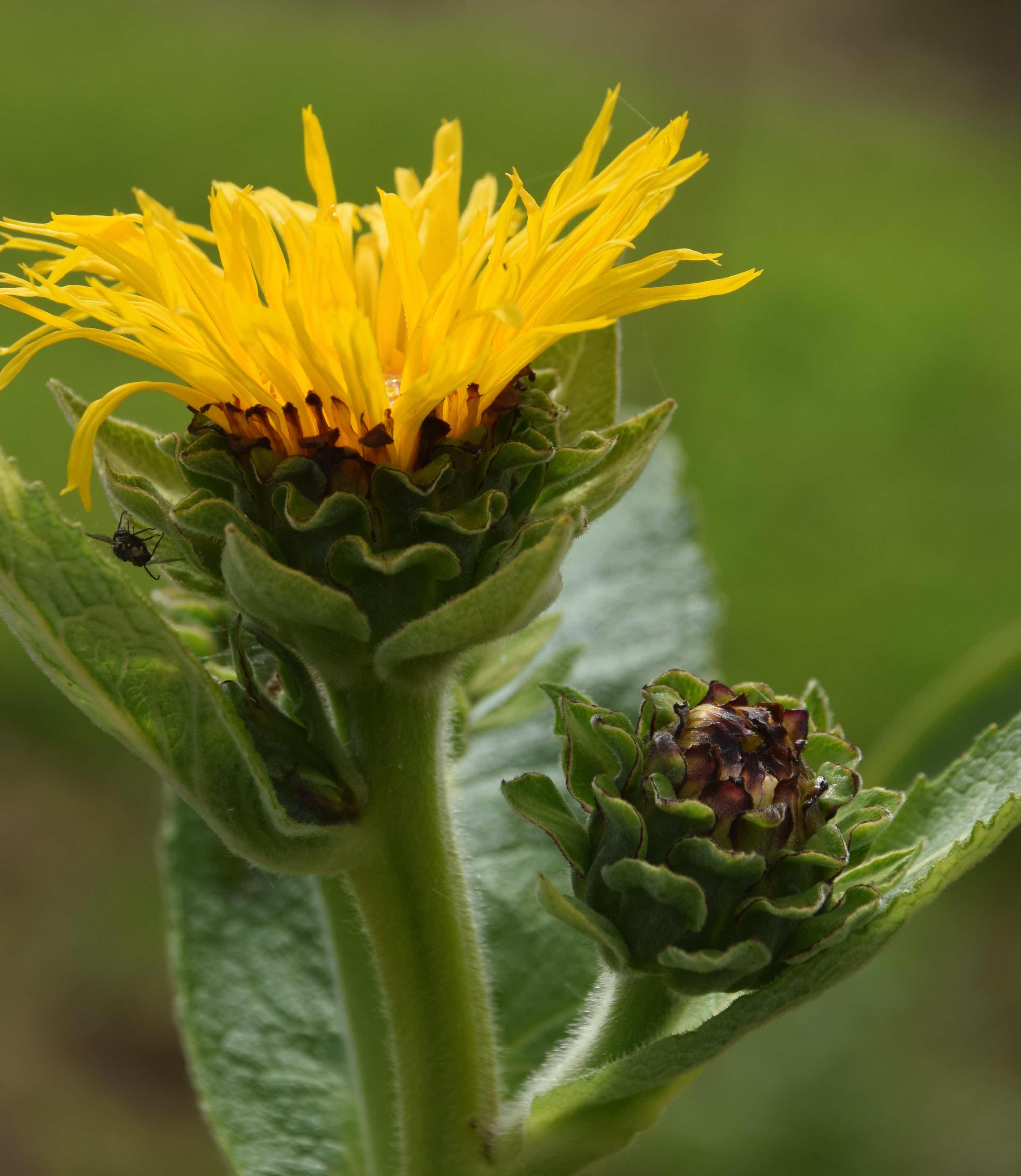 All inulas are native to Europe (generally) east into Asia, and need a sunny spot though they are not fussy about soil. Inula magnifica is clump-forming but some can be invasive. The bracts of this species, around the flower head, are thick and leafy and the buds resemble an artichoke (cynara). I must admit that it seems, on paper, to be similar to I. helenium and I am now pondering if I have the right plant. Whatever it is, as soon as flowering is over the plant is unsightly and old flower stems must be cut down and it is wise to have something in front of it to cover the dying leaves.