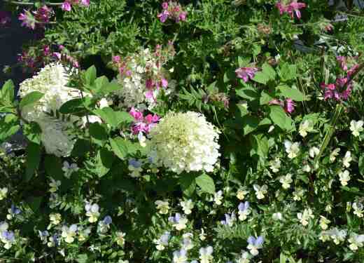 I underplanted with viola ‘Blue Moonlight’ which is a perennial viola and a very useful thing. I propagated a hundred or so last autumn and they have been planted in lots of places to provide easy, and fragrant, colour. They should cover the ankles of the hydrangeas. But the hydrangeas are so compact that the violas are threatening to swamp them! Worse, the pot of scented plants behind, filled with fragrant pelargoniums, lemon verbena and (unscented) Ageratum corymbosum, is making a tidal wave of growth that may swallow the hydrangeas. I could move the pot or, more practical, cut it back to take the necessary cuttings to maintain the plants. As it happens, having just written this, I went out and moved it! Right, back in.