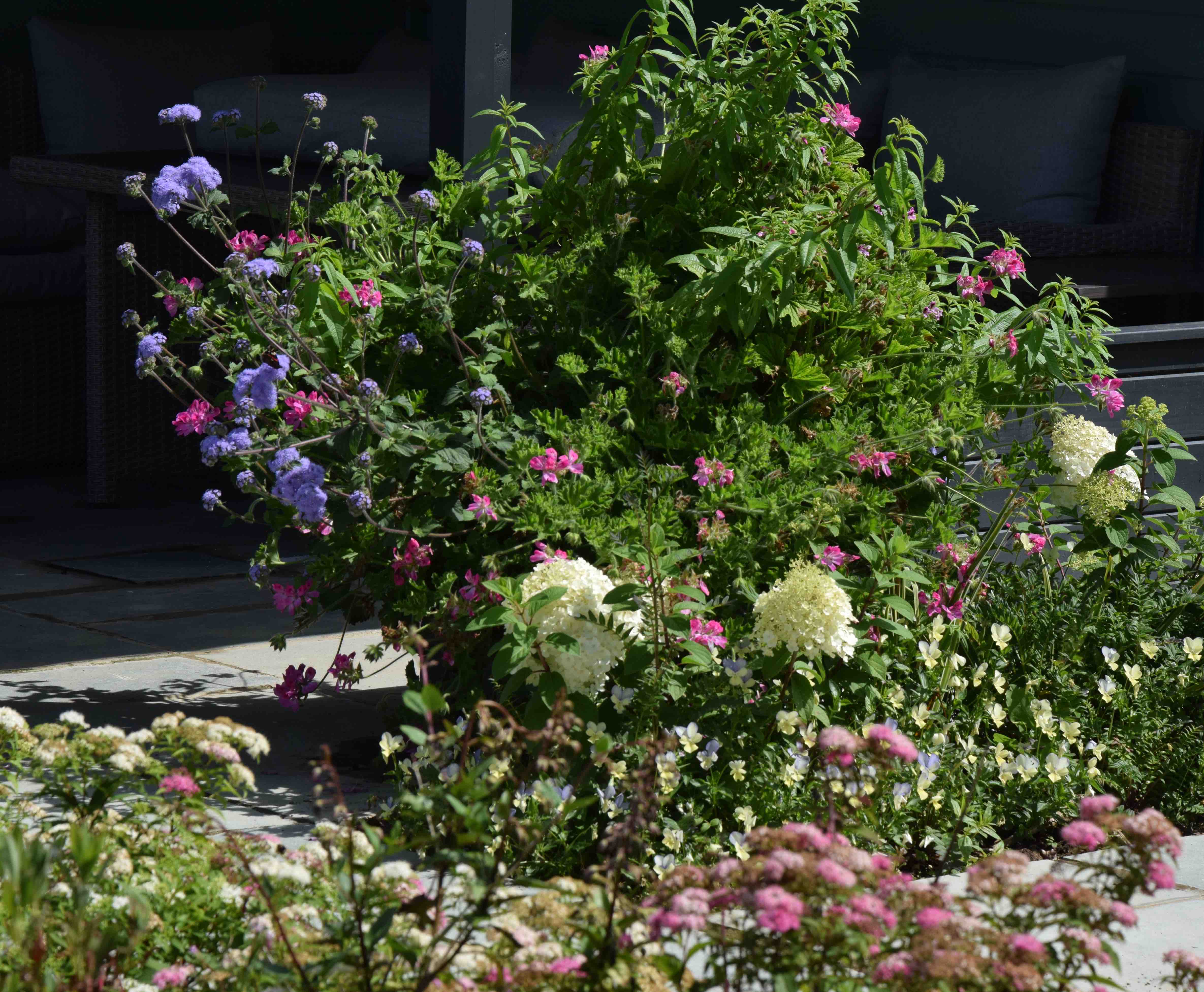 I underplanted with viola ‘Blue Moonlight’ which is a perennial viola and a very useful thing. I propagated a hundred or so last autumn and they have been planted in lots of places to provide easy, and fragrant, colour. They should cover the ankles of the hydrangeas. But the hydrangeas are so compact that the violas are threatening to swamp them! Worse, the pot of scented plants behind, filled with fragrant pelargoniums, lemon verbena and (unscented) Ageratum corymbosum, is making a tidal wave of growth that may swallow the hydrangeas. I could move the pot or, more practical, cut it back to take the necessary cuttings to maintain the plants. As it happens, having just written this, I went out and moved it! Right, back in.