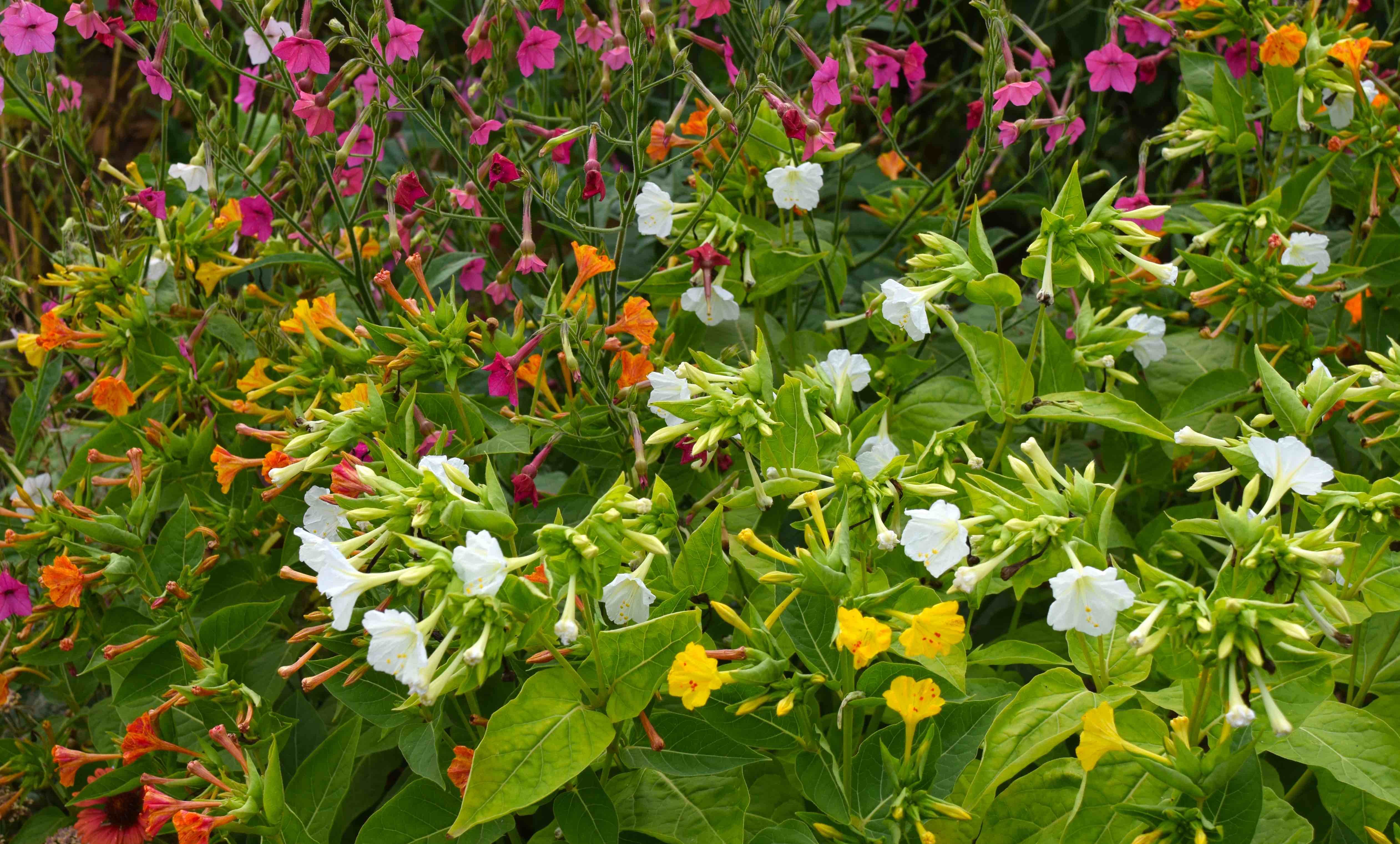 Mirabilis are best sown in gentle heat in March and planted out in late May. They will then bloom by late July and plants make large bushes, with a neat, rounded habit, about 1m high, less in poorer soils. They are effective garden plants that suit herbaceous borders and fill lots of space. Their mounded, dense habit makes them good for smothering weeds but but it does mean they can also swamp neighbouring plants.