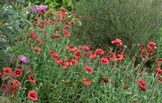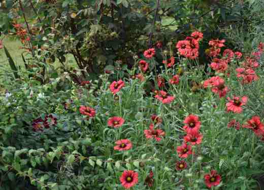 Gaillardias are often called blanket flowers and I am not sure if this is because: the flower patterns, in yellow and red, resemble the patterns that feature in the weaving of Native American people, who live where these plants flower; or because the flowers ‘blanket’ great areas of land when in bloom or because of the fluffy centre to the ‘flowers’. There are many species and I think these are G. pulchella which is an annual. But the annuals can overwinter in well drained soil and the perennials can die in wet soils and are not longlived anyway. The annuals are often sold as doubles, which have pompon flowers in fiery shades but I like the singles far more.
