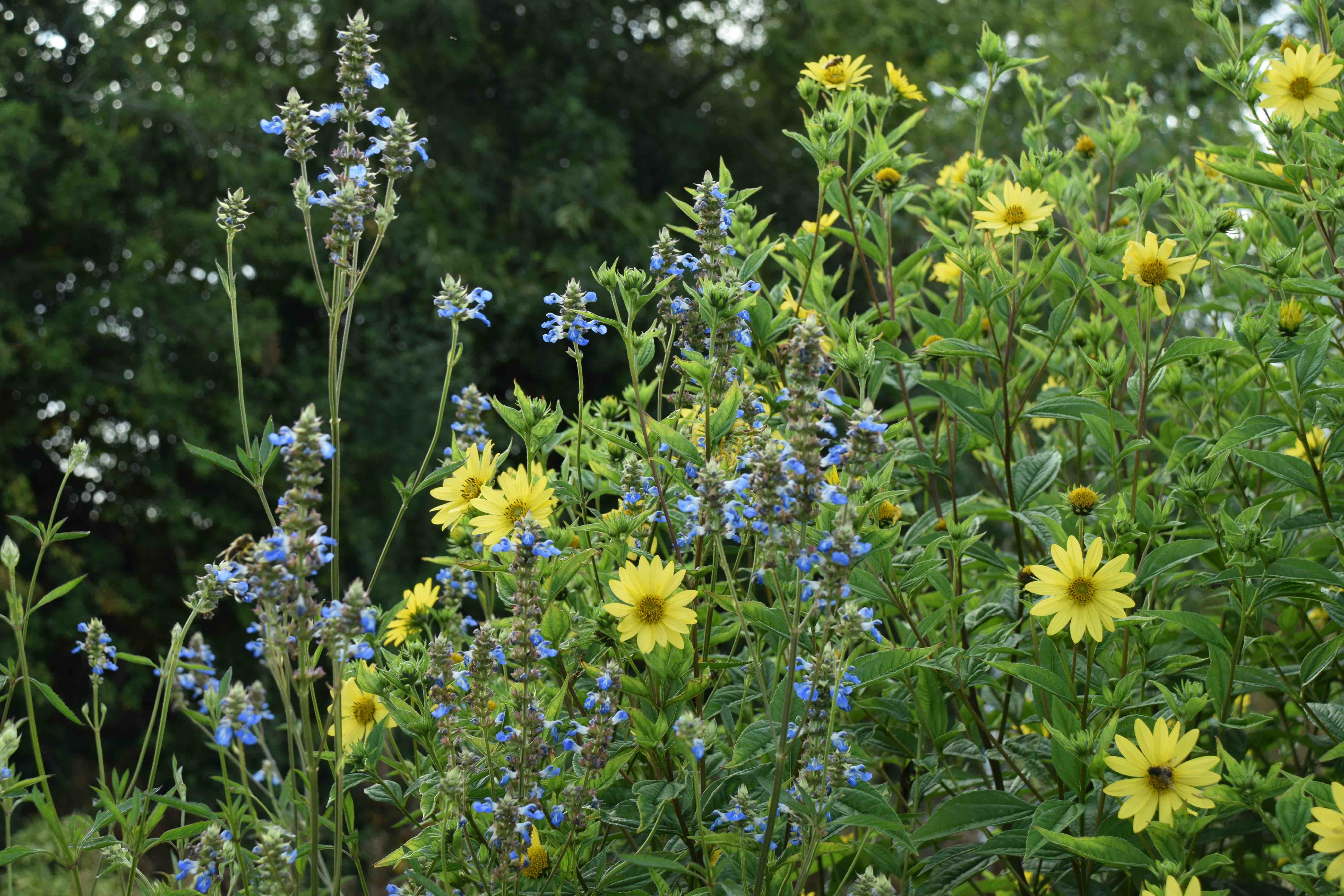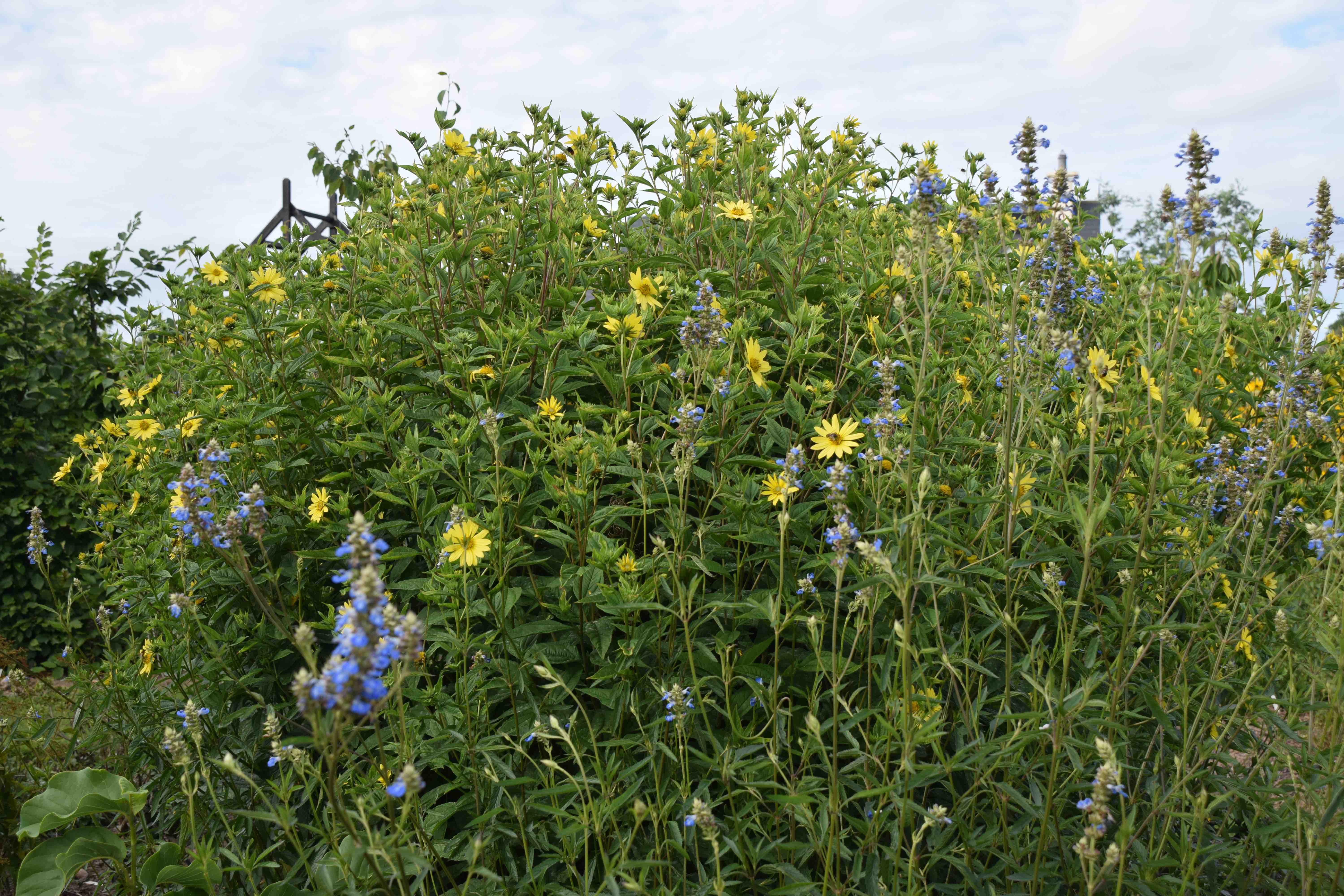 Blue and yellow has always been a favourite pairing of colours and last year I thought how well helianthus ‘Lemon Queen’ would look with the tall wands of Salvia uliginosa. I had both in the garden but not together. So I moved some of both this spring to a new bed that had been made. In theory the bed is moist but, of course, it has not been this summer. But being in new soil which was enriched with some compost before planting, the helianthus and salvia have grown far better here than where they have been established a few years.
