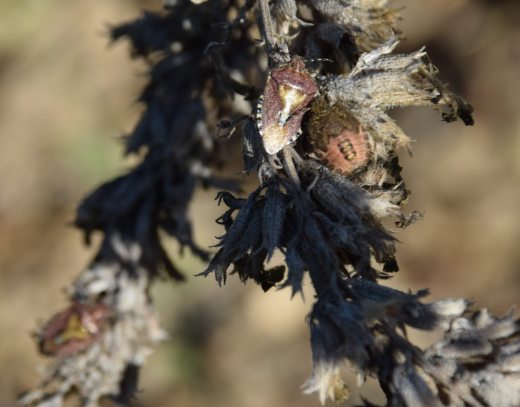 Dock bugs apparently mate and lay eggs in spring, which makes me wonder if the pairs I found were just being romantic. The adults overwinter on old dock flower stems and they prefer to suck on docks (rumex) and related plants. That makes a lot of sense since the surrounding field has lots of docks and nearby is my clump of rhubarb.