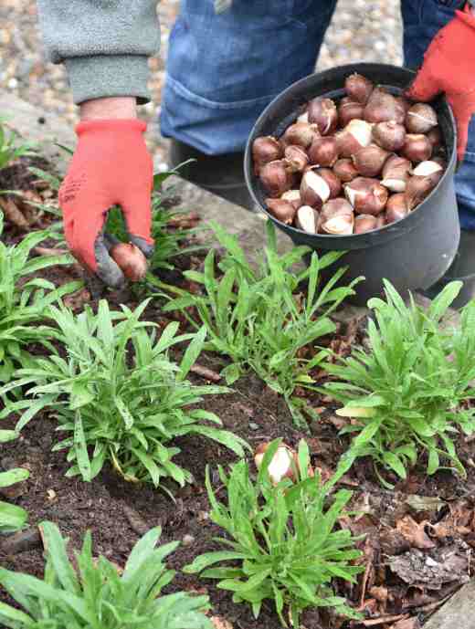 Once they were in, and watered, it was time to pop in the tulips between them. Always put in the plants first and the bulbs after – so you don’t push a trowel through the bulbs when you plant! I am putting bright red tulips in this year after the pastel yellow of last year. The photo above is actually faked because these are the yellow tulips, that I saved and sorted and will be put somewhere else. The red tulips have not arrived yet but as you can plant tulips in November without any harm, they will be added in a few weeks, if the package from The Netherlands is not held up in customs for a month, as it was last year!