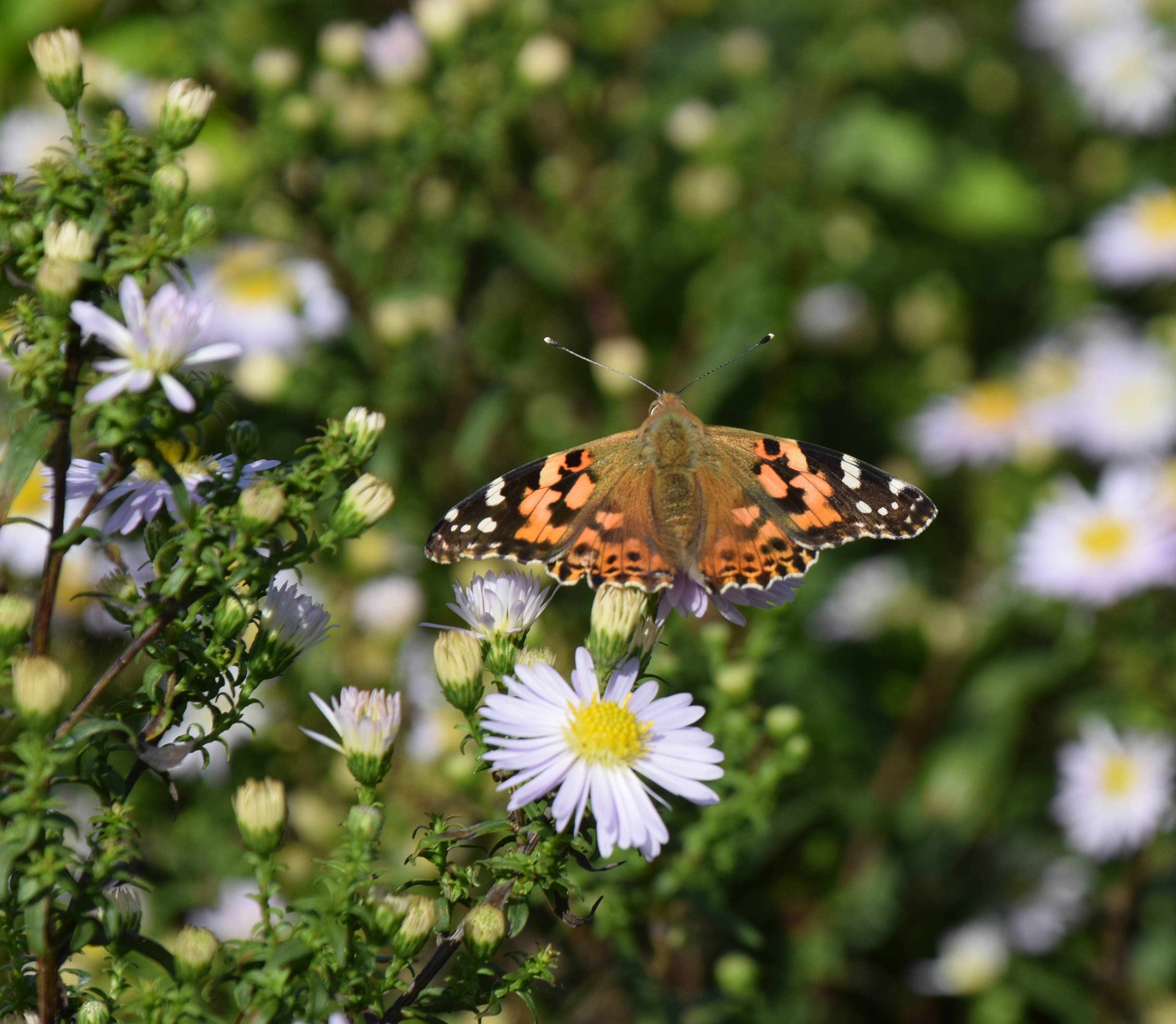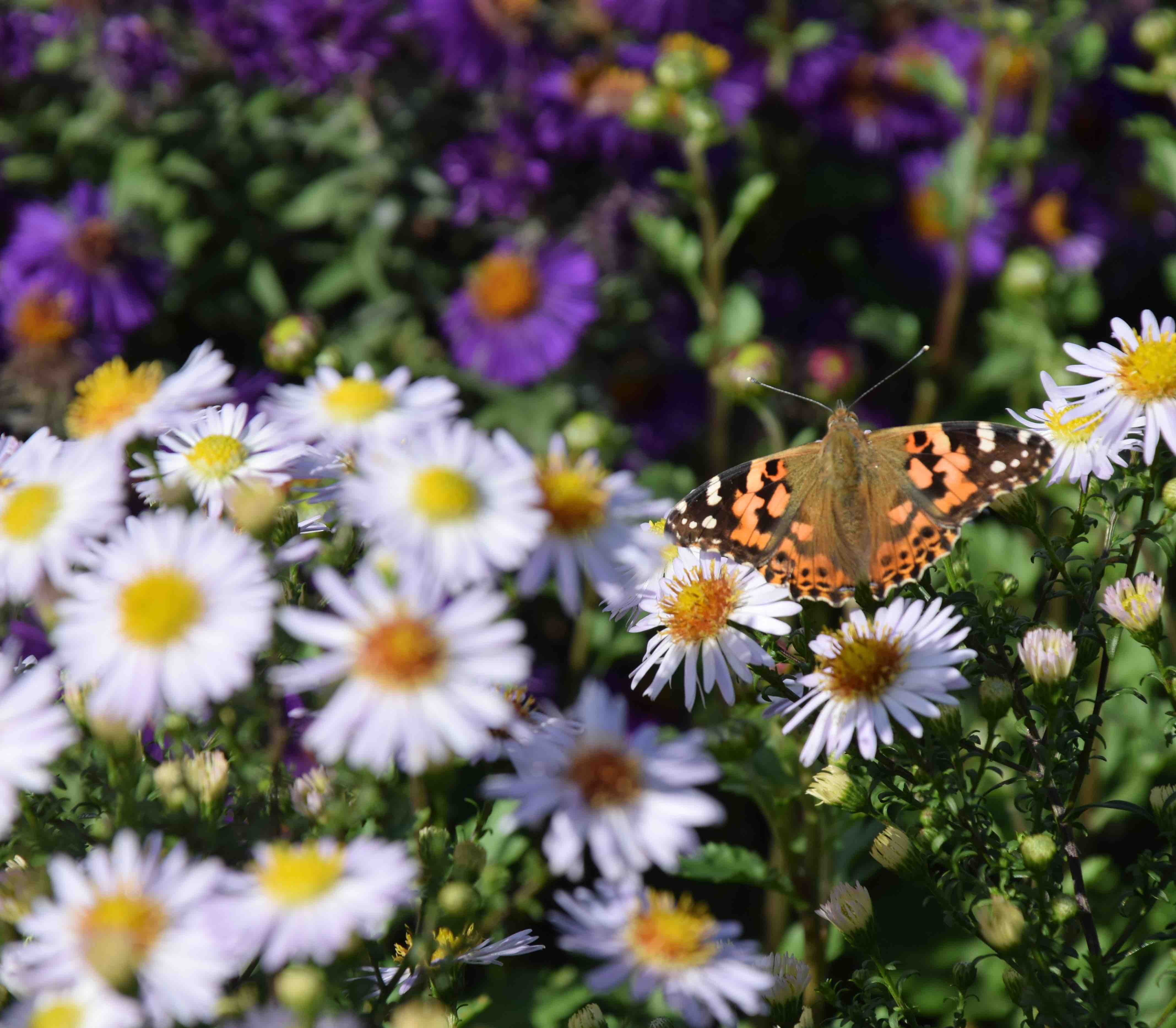 Autumn is very firmly in charge now and most of the apples are picked, apart from some late varieties that I will leave on the trees, to mature as long as possible. But there is still colour in the garden. Some plants are naturally late and the first flowers on the chrysanthemums are only just opening. But the asters (which are not asters any more so I will call them Michaelmas daisies – though Michaelmas is now long gone – Sept 29) are getting better every day. Yesterday some painted ladies joined the party.