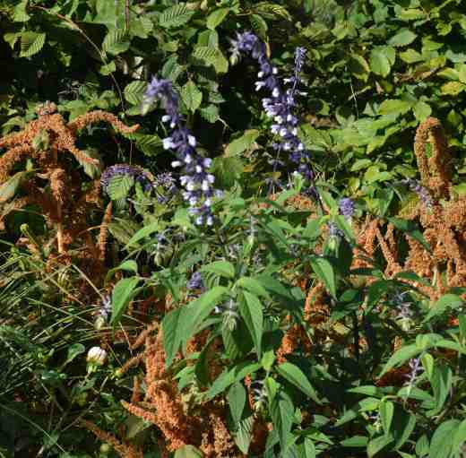 I never have any such fear about Salvia uliginosa which is almost becoming a weed, this clump having grown from the few pieces left when I moved most of it this spring. I will have to take it firmly in hand but, at this time of year, I can forgive it anything – even its staggering around like an inebriated stiltwalker.