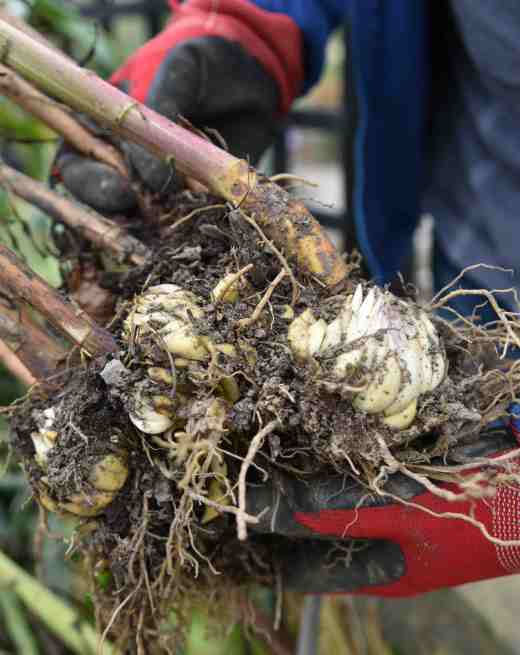 So lift the clumps carefully, making sure you dig deep and lift the clumps, then shake off the soil and cut back the old stems. You can then split the bulbs either singly or into groups of two or three.