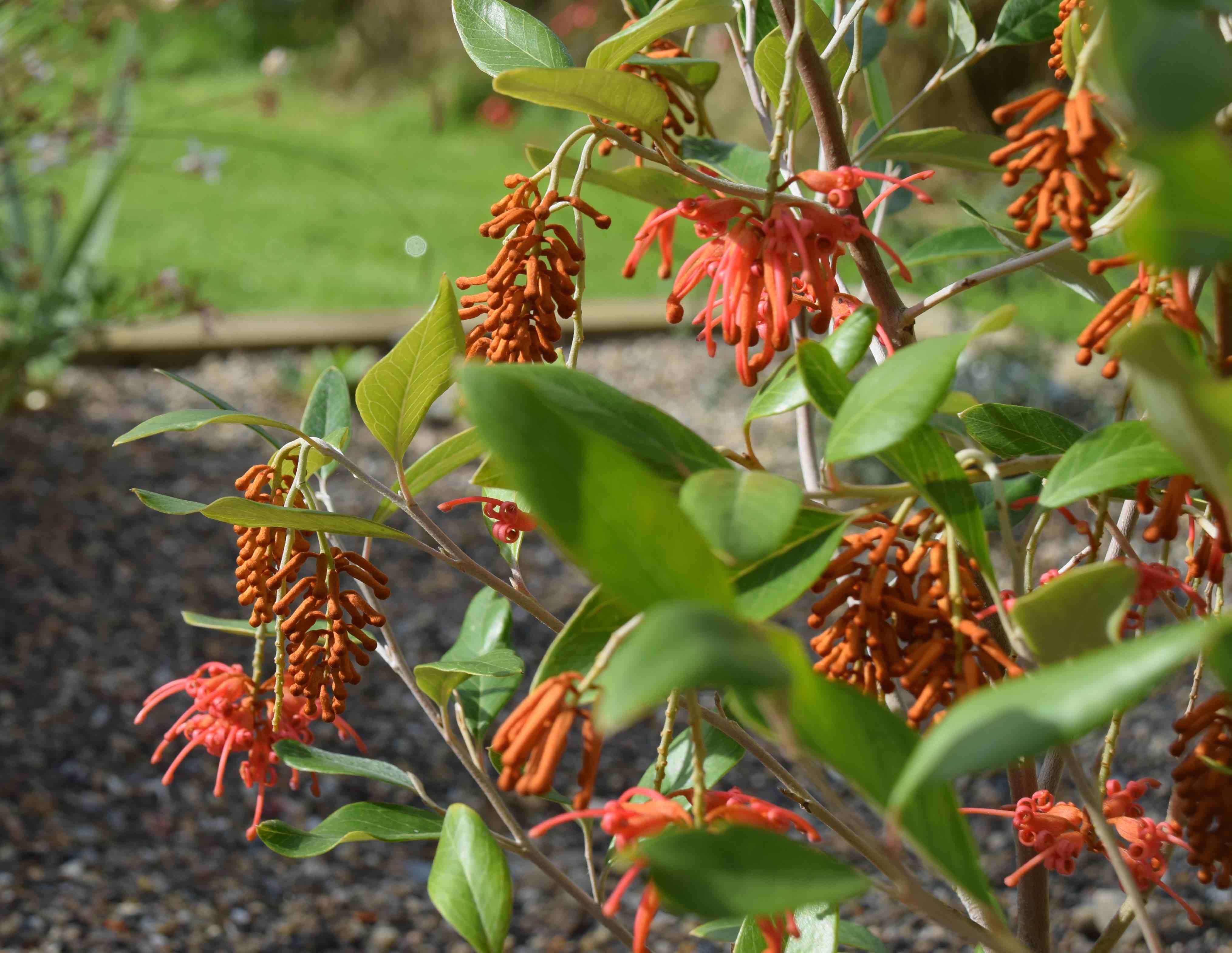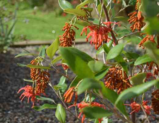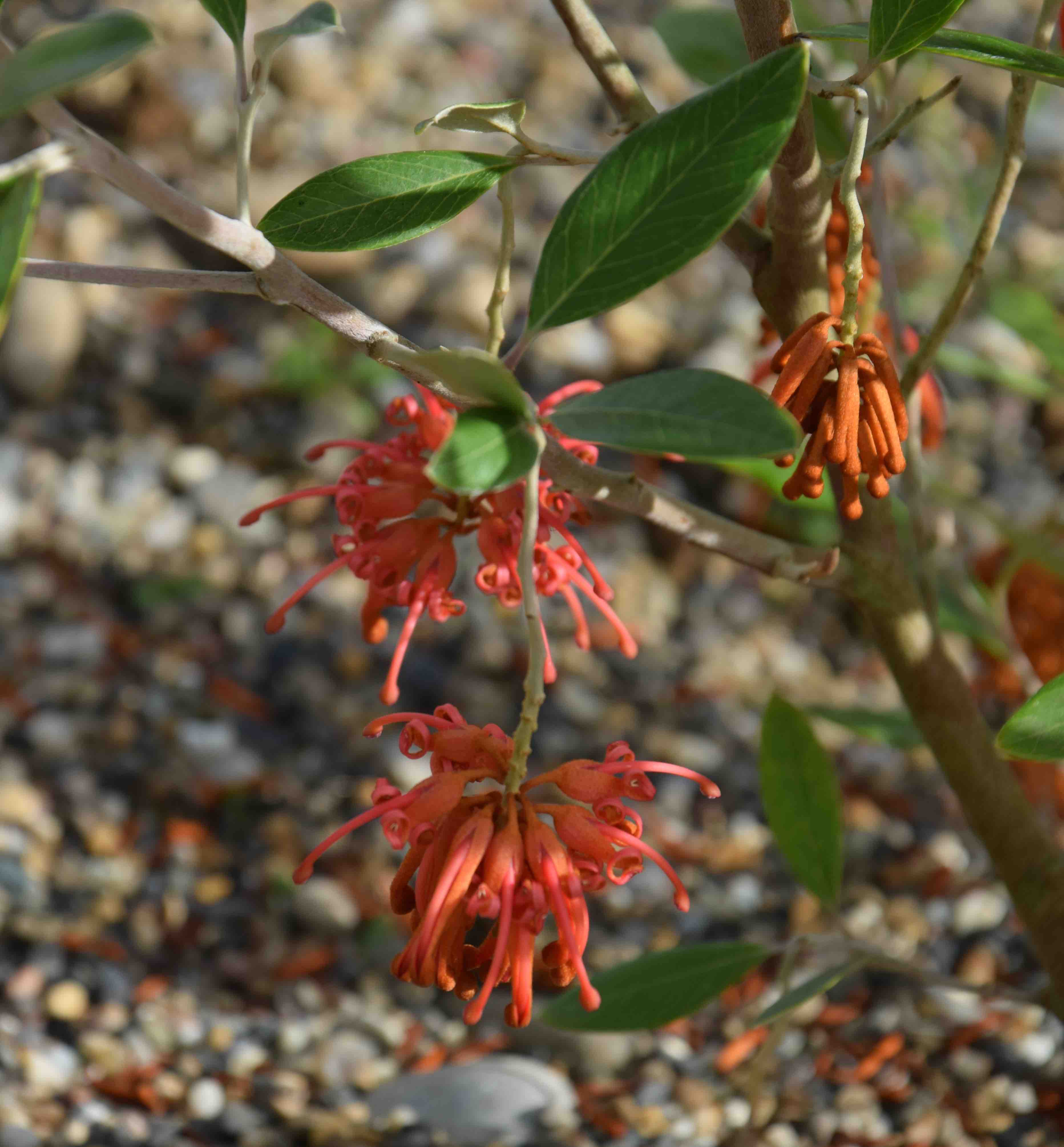 In early summer I bought a Grevillea victoriae, partly because it was reasonably priced and thought that it would not be too much of a financial risk. The species is native to New South Wales and Victoria in Australia and is supposed to be one of the hardiest species. This seems unlikely because the foliage, unlike most of the hardiest grevilleas, is not finely divided but entire, olive green above and grey below. The flower buds form in summer and are reputed to be prone to dropping off if it gets too hot in summer. I think this is only a issue in hot climates and was not a problem here. The flowers open, from clusters of rusty buds, in autumn and winter, and my plant is just starting to bloom. As expected, they are very exotic and colourful.