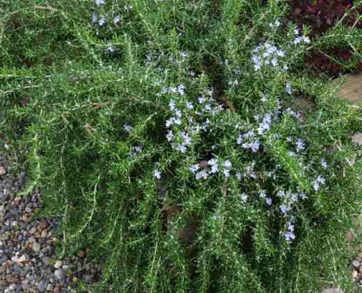 The rosemaries, which often bloom in winter instead of spring, are now in full flush.