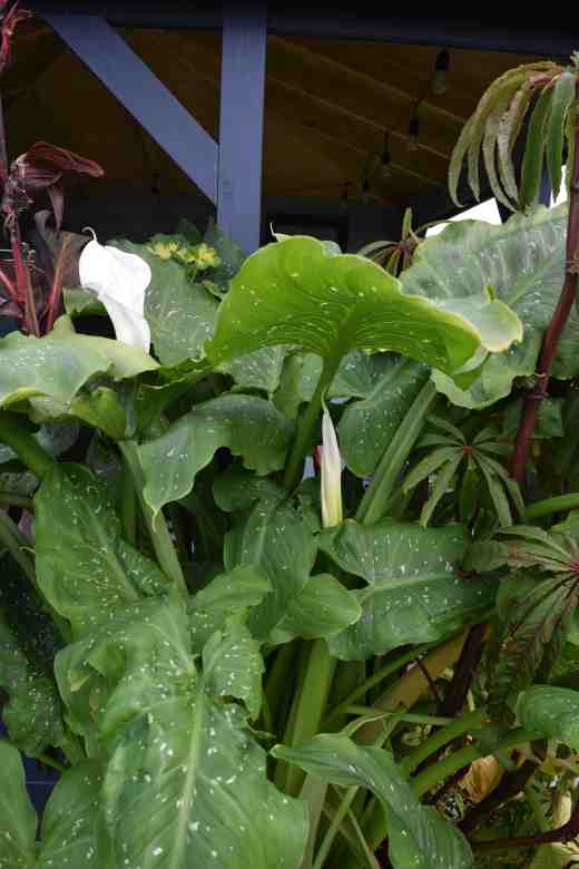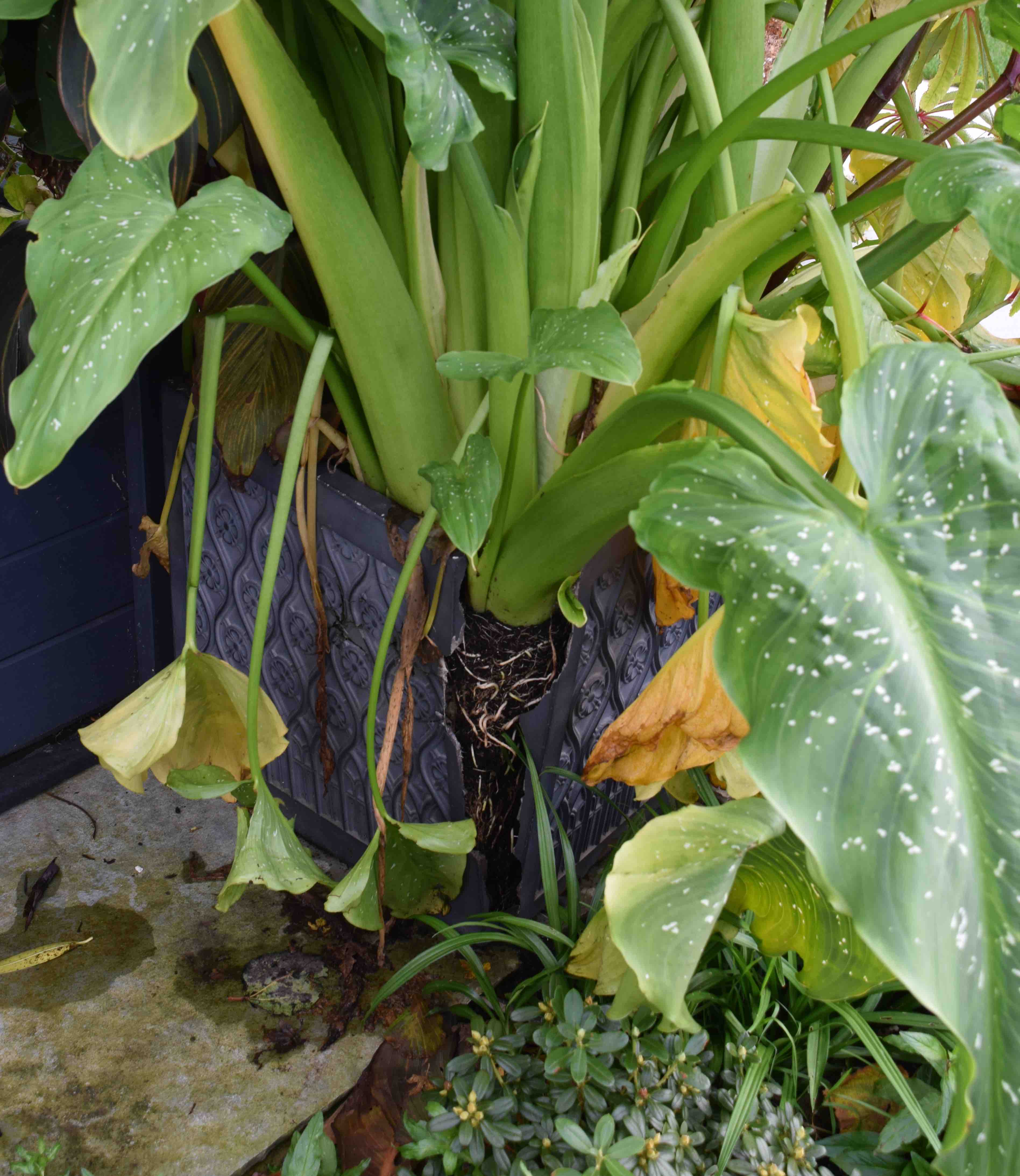 Perhaps the biggest clump is in the pot it shares with a canna and Begonia luxurians, that I have shown before. Every day I think I must remove the plants from the pot, but the production of new flowers has put me off hacking the plant to bits to get it out. And I was worried that I would not be able to remove the plants without damaging the fibreglass pot. Well, I don’t need to worry any more.