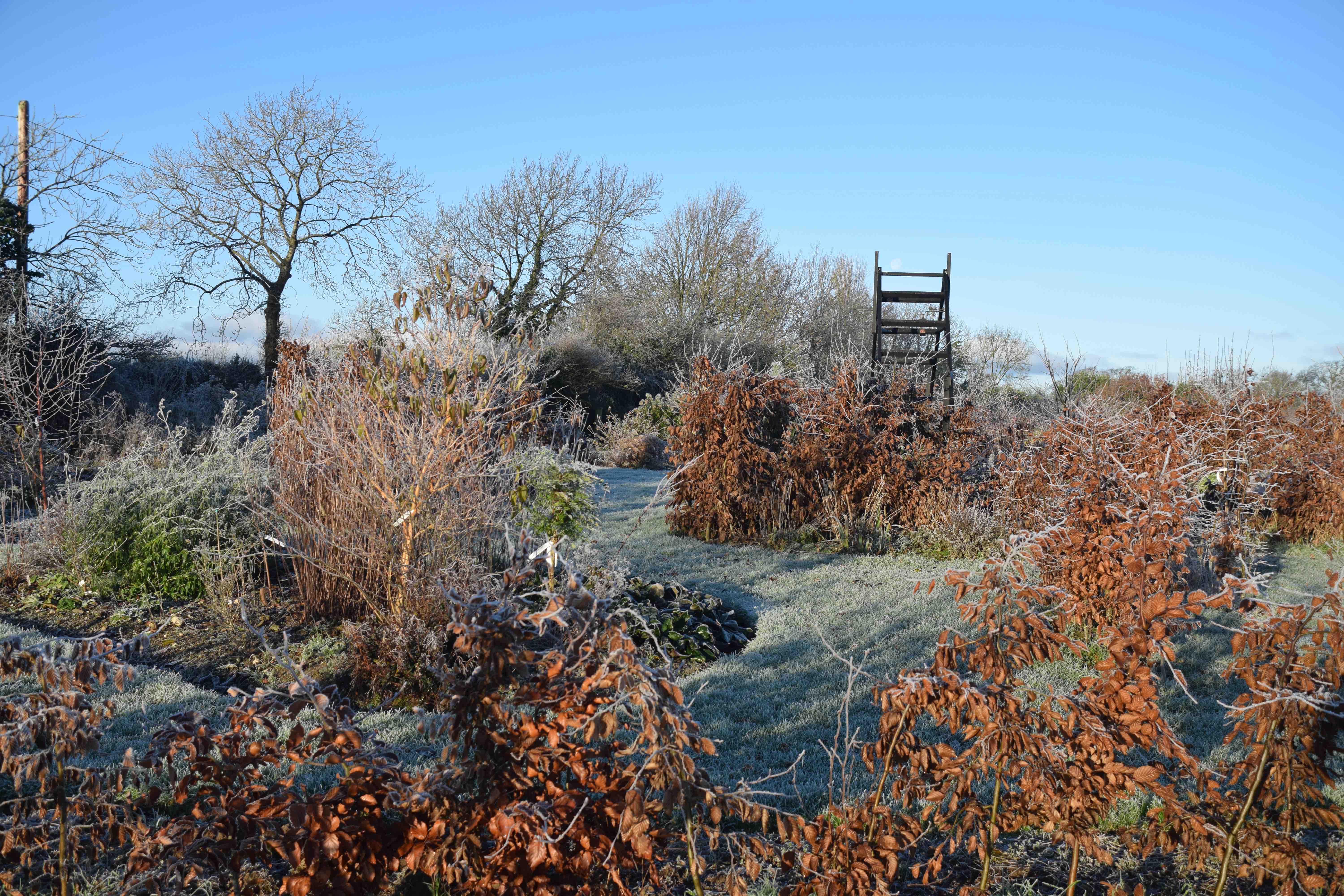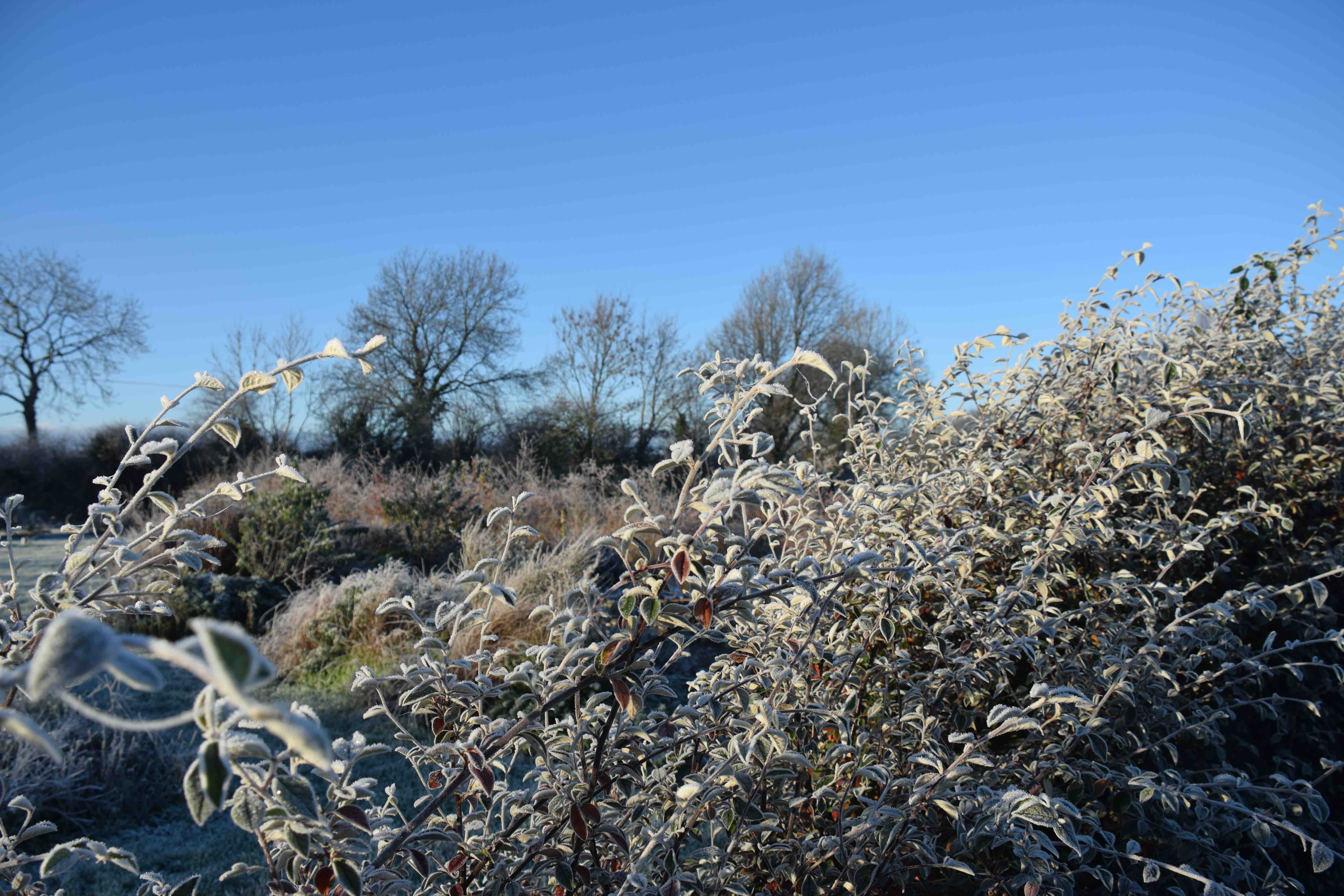 Having spent the autumn moaning about the wind and rain it would be unfair of me to ignore the fact that it is now bright and frosty. We have had cold days and even colder nights with temperatures dropping to -3c. This is not exceptional and yesterday, up the road, it was -5c – (in Braemar, Scotland, it fell to -17c and only rose to -9c yesterday). What is slightly unusual here is that days are barely above freezing, if at all. We are milder here than many areas and we have no snow, though it rained yesterday evening and that froze overnight. Cold makes me panic about the garden and the tender plants in the greenhouse, but i should just ‘chill’ and enjoy the frost.