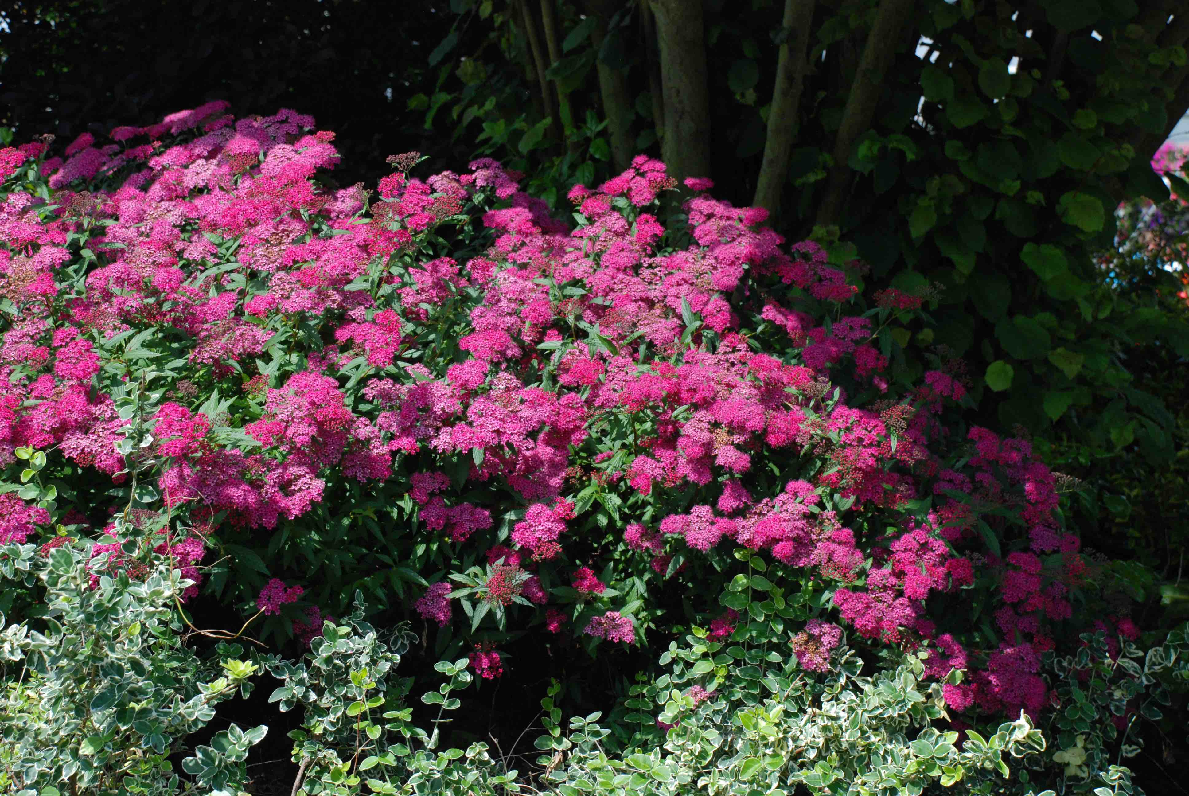 Anyway, back to pruning. These pink, summer-flowering kinds are best pruned in spring. You can give a light trim after flowering is you like, to remove the old flowers, which tend to die pale brown. But a light prune in sprig is best. Every two or three years it is worth giving a hard prune, the sort of prune that happens to them in supermarket carparks so they can get to the crisp bags and lager tins. This encourages strong new growth. It is also a useful thing with ‘Goldflame’ because it promotes strong foliage and delays flowering. I don’t mind this at all because I am never quite sure if the flowers look good with the foliage anyway. Above is ‘Anthony Waterer’ and old cv. with purple-tinted deep pink flowers. Like many of this group it can get mildew in a hot, dry summer, perhaps its greatest flaw. While it is not very popular because it just has green leaves, it is hard to beat for its bloom and, like all spiraeas, it is good for pollinators.